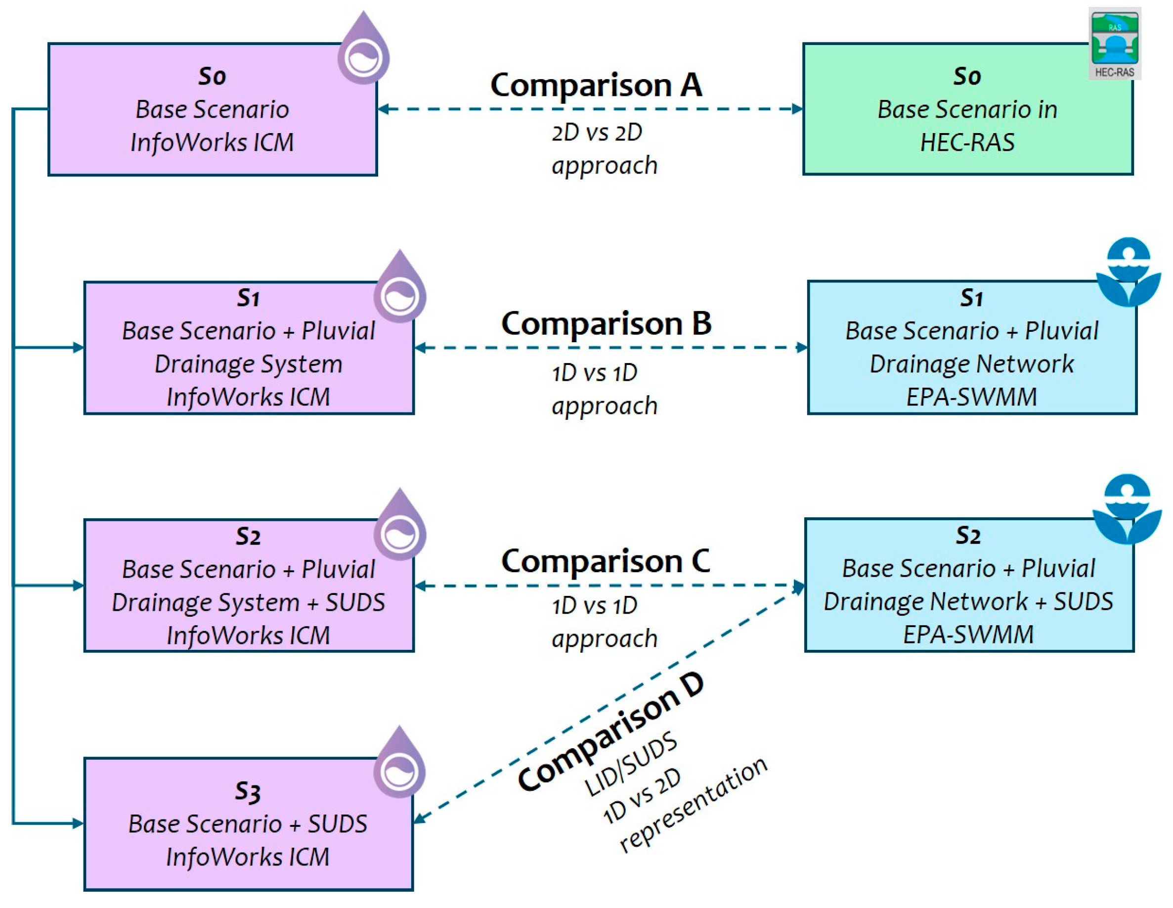 - Comparison D: This scheme compares LID/SUDS objects using EPA-SWMM 5.2 and InfoWorks incorporated tools, limited to a 1D approach, and a 2D representation using polygons with adapted meshing, infiltration, and roughness characteristics. This scheme will explore the representation of LID/SUDS control elements directly in the 2D domain, rather than as part of a 1D/2D coupling. The 2D representation was compared to the widely used 1D representation, and the effects on both outcomes were analyzed.