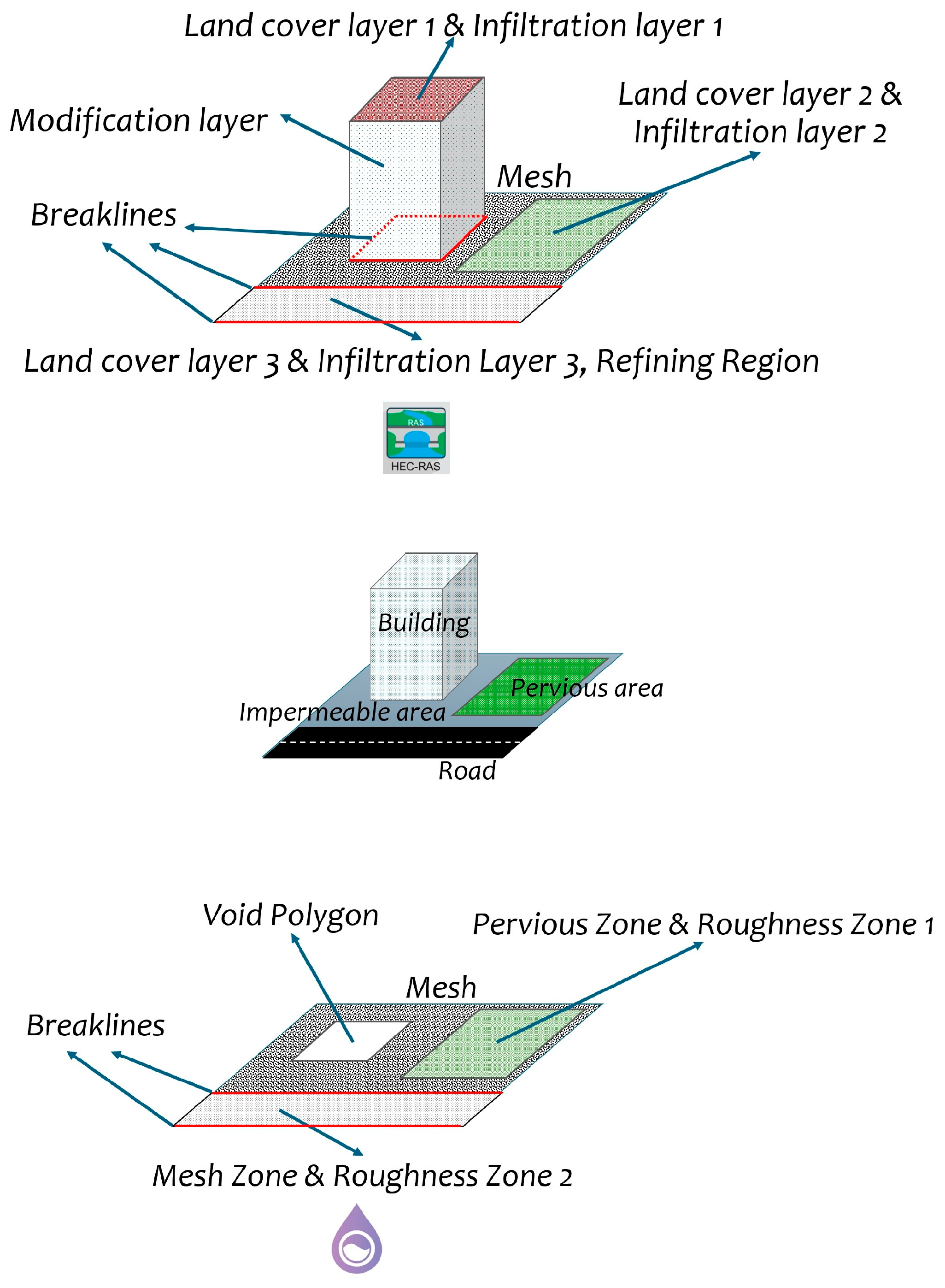 - Efficiency of LID/SUDS control objects on the propagation of the runoff: A 2D approach (rain-on-grid) is required to define the urban features using a combination of InfoWorks ICM 2021.9 void polygons, mesh zones, roughness zones, infiltration zones (2D), and general lines (as break lines).