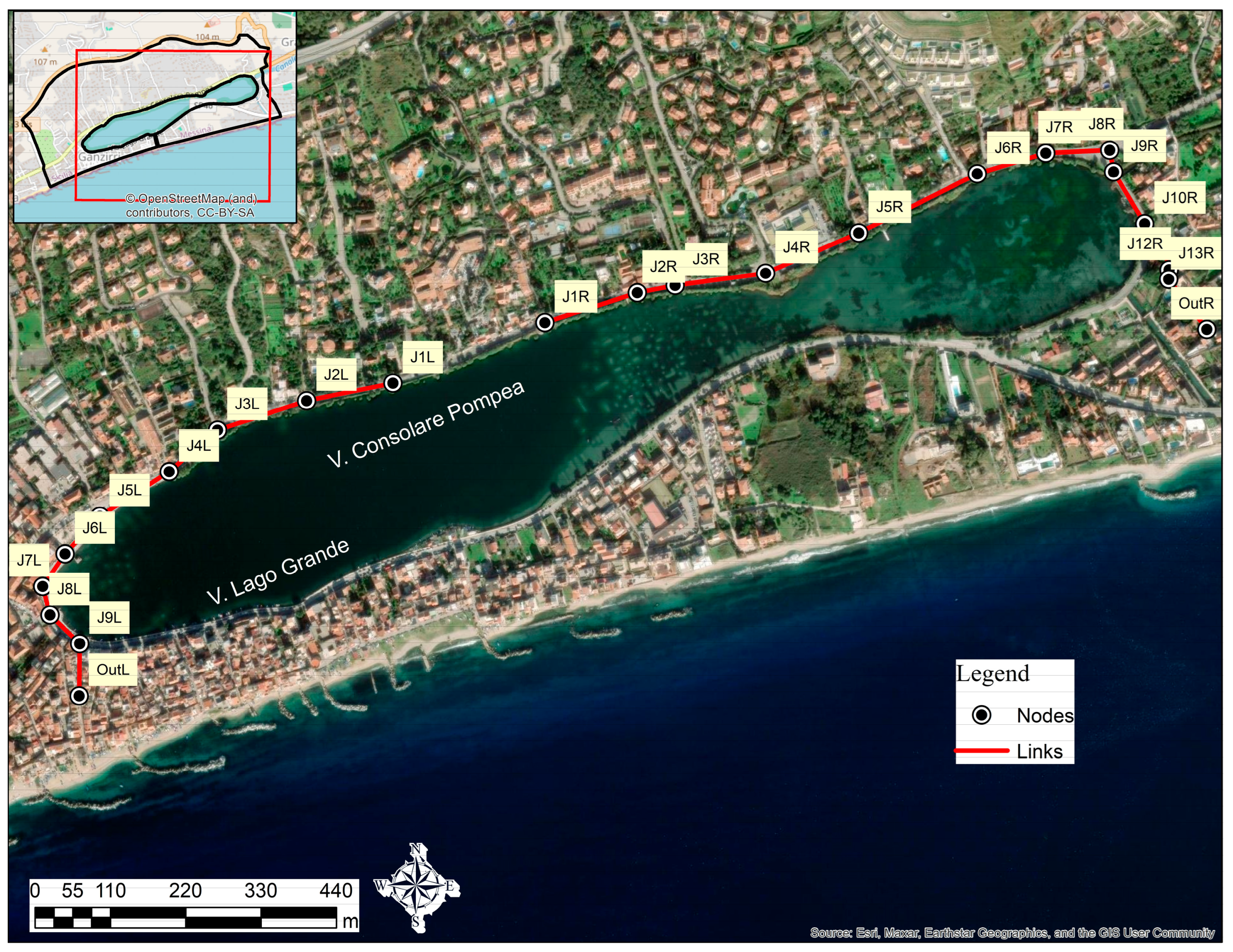 - Comparison B: This scheme compares a simulated scenario with a proposed pluvial drainage system modeled using InfoWorks ICM 2021.9 and EPA-SWMM 5.2 with a 1D approach. This section explored the differences in using a lumped approach on both software packages. The pluvial drainage system was suggested to drain the runoff of the urbanized area between Via Consolare Pompea and Panoramica del Stretto.