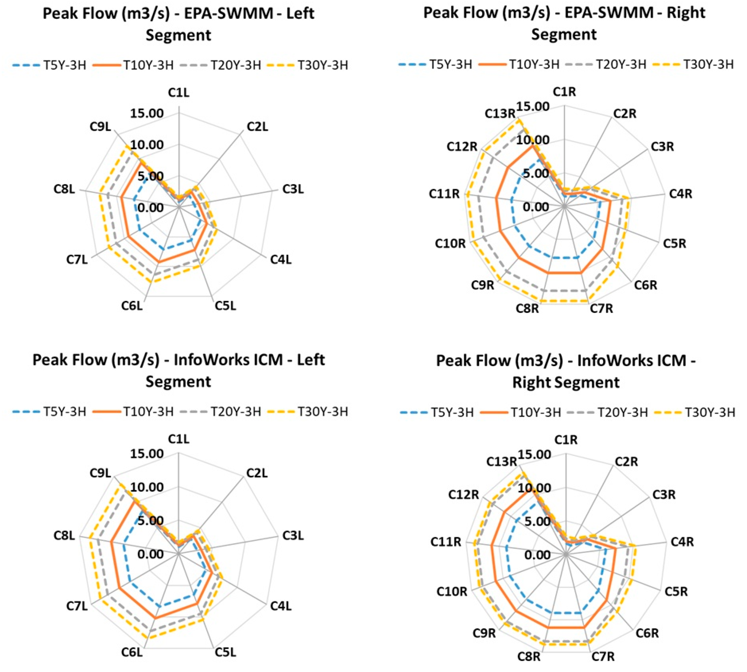 - Comparison C: We explored implementing LID/SUDS elements using incorporated tools in InfoWorks ICM 2021.9 and EPA-SWMM 5.2, which are only available using a 1D approach. A drainage system is required. Therefore, we used the same simulation scenario for comparison B, adding LID/SUDS elements.