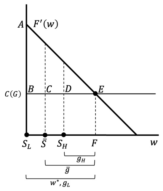 In this simplified static problem, if the groundwater stocks are equal, that is, and so are the unit costs, then the benefit-maximizing amounts of water use are also the same, , and so are the expected pumping costs. Figure 1 illustrates this. The user maximizes its net economic benefit, by controlling its water use, . To simplify the figure, we assume surface water takes between () and , with a probability of for each and with the mean value . If we assume out the possibility of exhausting the entire stock, we know from the first-order condition, , that, irrespective of the surface water realization, the benefit-maximizing water use, , is determined by point , where the marginal benefit is equal to the marginal cost, . Then, the groundwater intake, , is given by the difference , which means for , for , and for . The pumping cost is thus shown by the area for and for . Therefore, the expected pumping cost in the uncertain case is given by the area , which is equal to the pumping cost in the certain case.