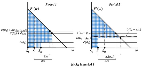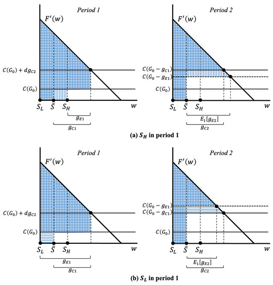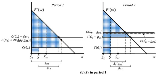But the truth is that the impact of the fluctuation does not disappear at all. It is transferred to period 2 through the corresponding change in the groundwater stock and unit cost, which is represented by the differences between the solid and dotted horizontal lines on the right side of Figure 2a,b.