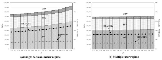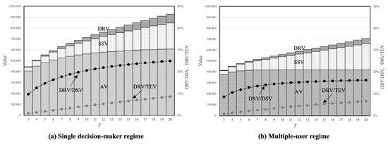 Figure 5 shows how the AV, SSV, and DRV change as the number of stages increases. First, all values including the DRV increase but in different manners. The increment in the AV over s decreases as increases. This is because of users’ intertemporal levelling behaviour of groundwater within a given stock amount. The SSV increases linearly; the increment in the SSV is constant. In contrast, the increment in the DRV increases. This is because the impact of the intertemporal reallocation is transferred to the following stages through the corresponding changes in stock and cost. As a result, the share of the DRV in the DSV and TEV increases as increases. Second, the multiple-user regime exhibits lower values except for the SSV. In addition, the share of the DRV in the DSV and TEV is lower in the multiple-user regime. The results for the AV and SSV are consistent with the findings of the previous studies. For instance, Msangi and Hejazi [13] showed that suboptimal behaviours do not diminish the SV unless physical constraints on extraction capacities exist, but our results indicate that even if the constraints do not exist, the DSV can be impaired due to the decrease in the DRV. As we can see in (18), the users respond to surface water fluctuations by more than the amount of variations, but the magnitude is weaker in the multiple-user regime. The overexploitation in a suboptimal environment hinders users from fully utilizing reallocation opportunities.