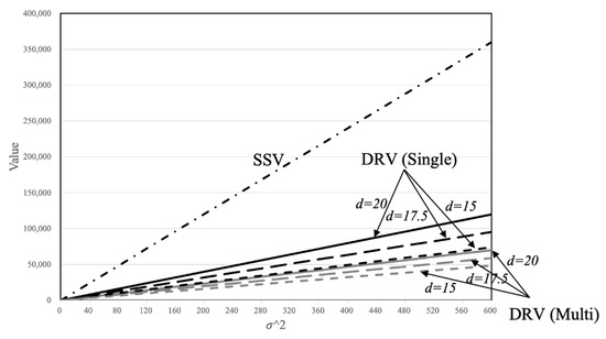 Figure 6 shows how the SSV and DRV change as the variance of the surface water fluctuation increases. Both increase linearly; however, the slope of the DRV is smaller. This is because the DRV is a by-product of the stabilizing behaviour, and therefore utilizes fluctuations to a lesser extent than the SSV. Again, the slope of the DRV is smaller in the multiple-user regime. Figure 6 also shows how the SSV and DRV respond to different levels of , pumping cost elasticity to changes in stock level. The slope of the DRV increases as increases. This indicates a significant difference, with an implication from the existing studies that the elasticity has no effect on the SV since it is determined only by the risk premium in (4).