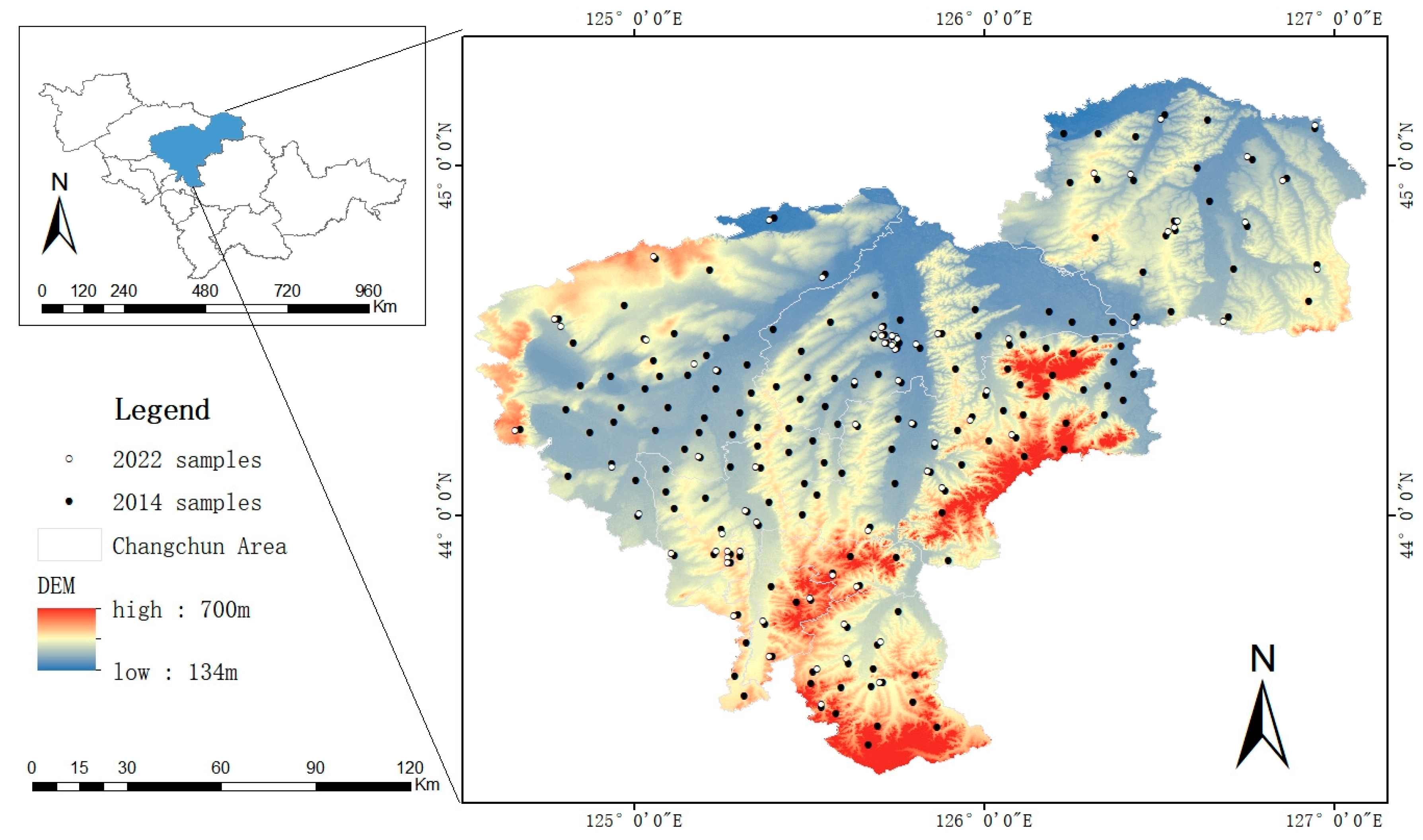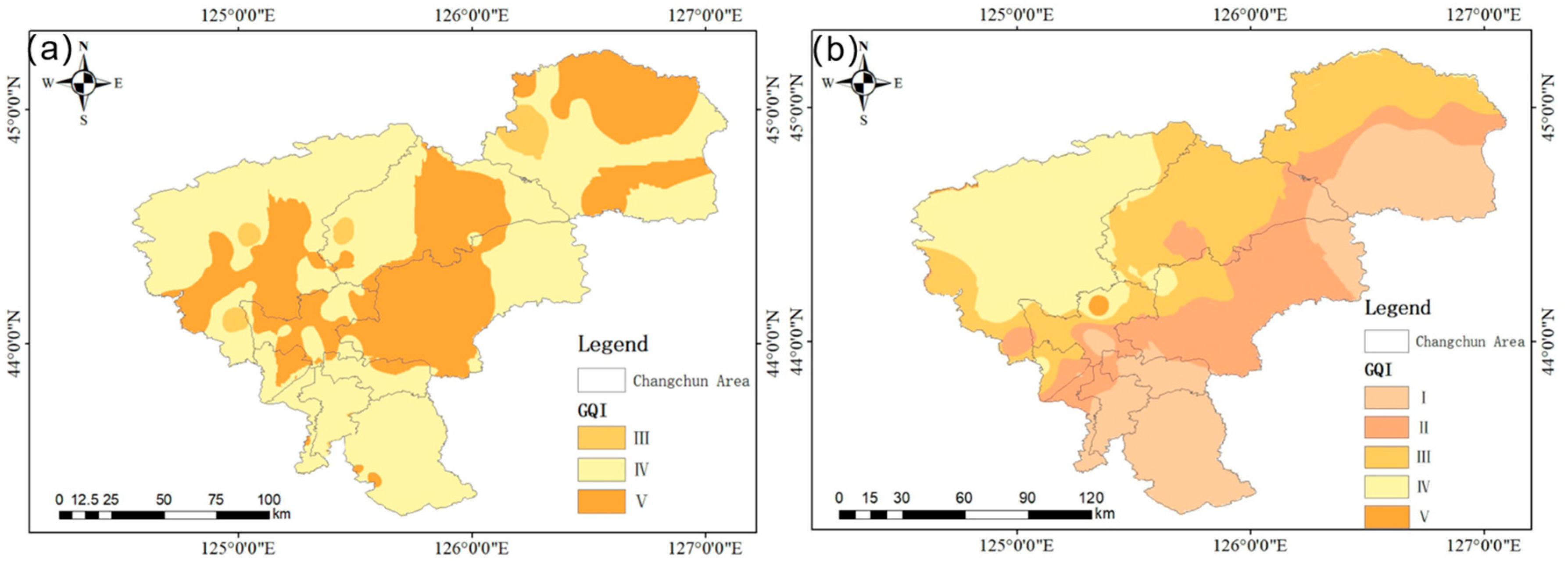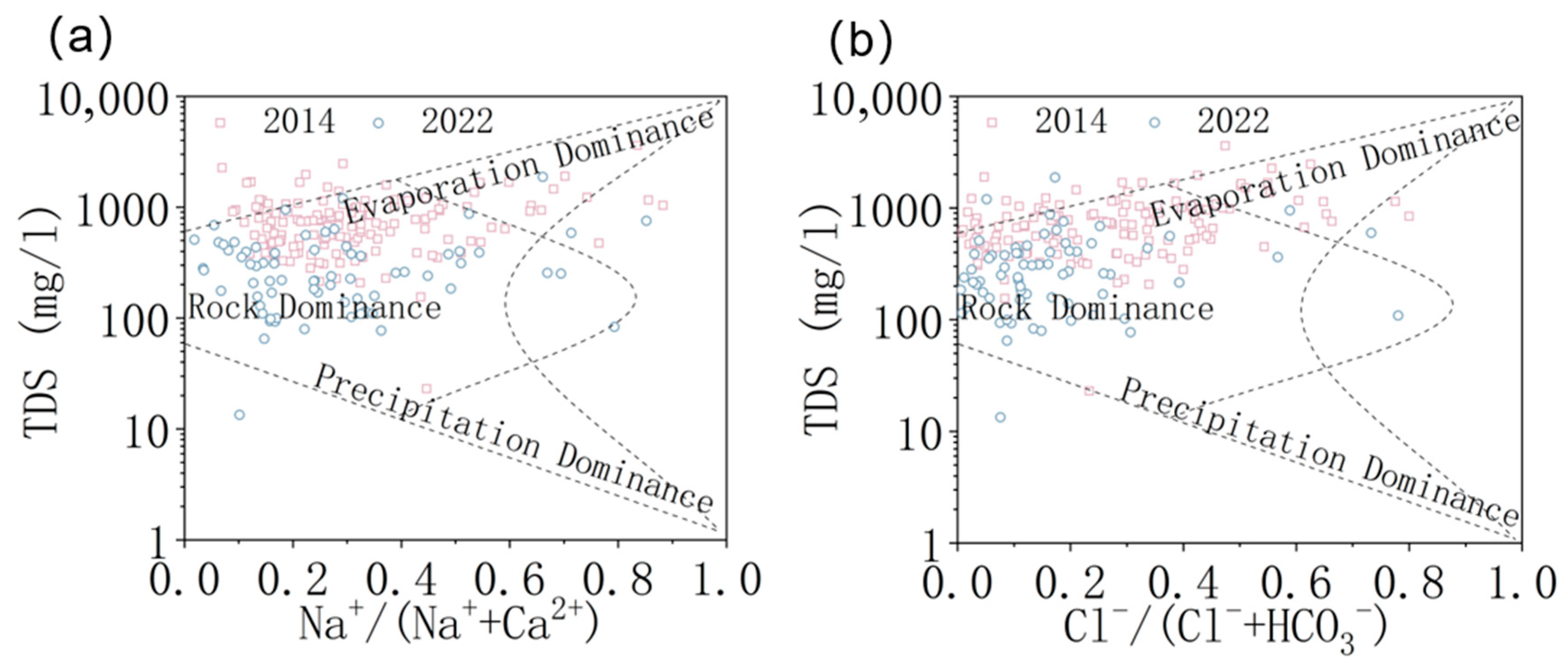 - In 2014, groundwater quality was poor overall, dominated by Class IV and V water with minor distribution of Class III water in the west and northeast and no Class I–II water. In 2022, Class I–IV water predominated, exhibiting a southwest–northeast banded pattern. Although general water quality improved, localized deterioration was observed in central and northern zones.