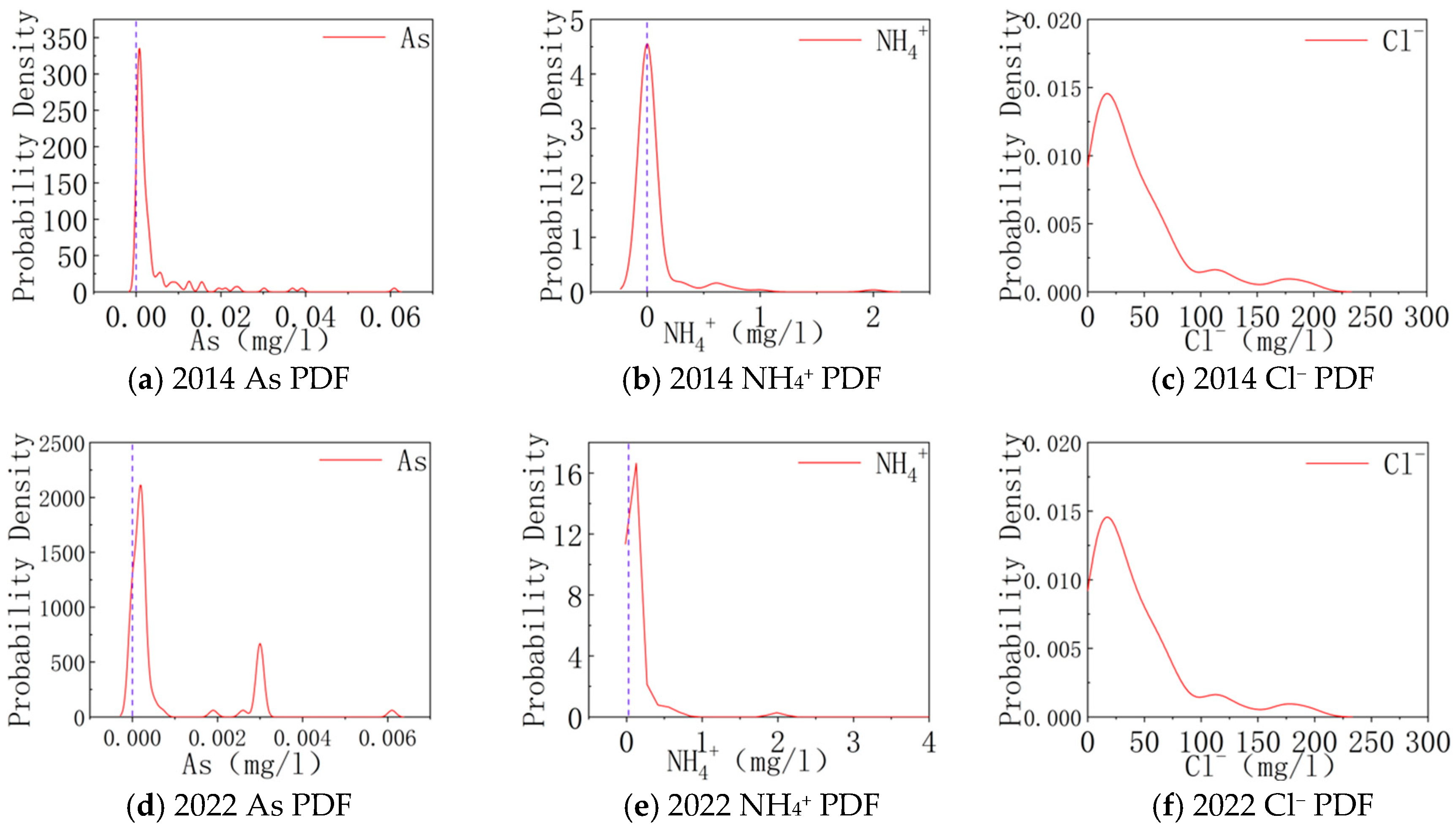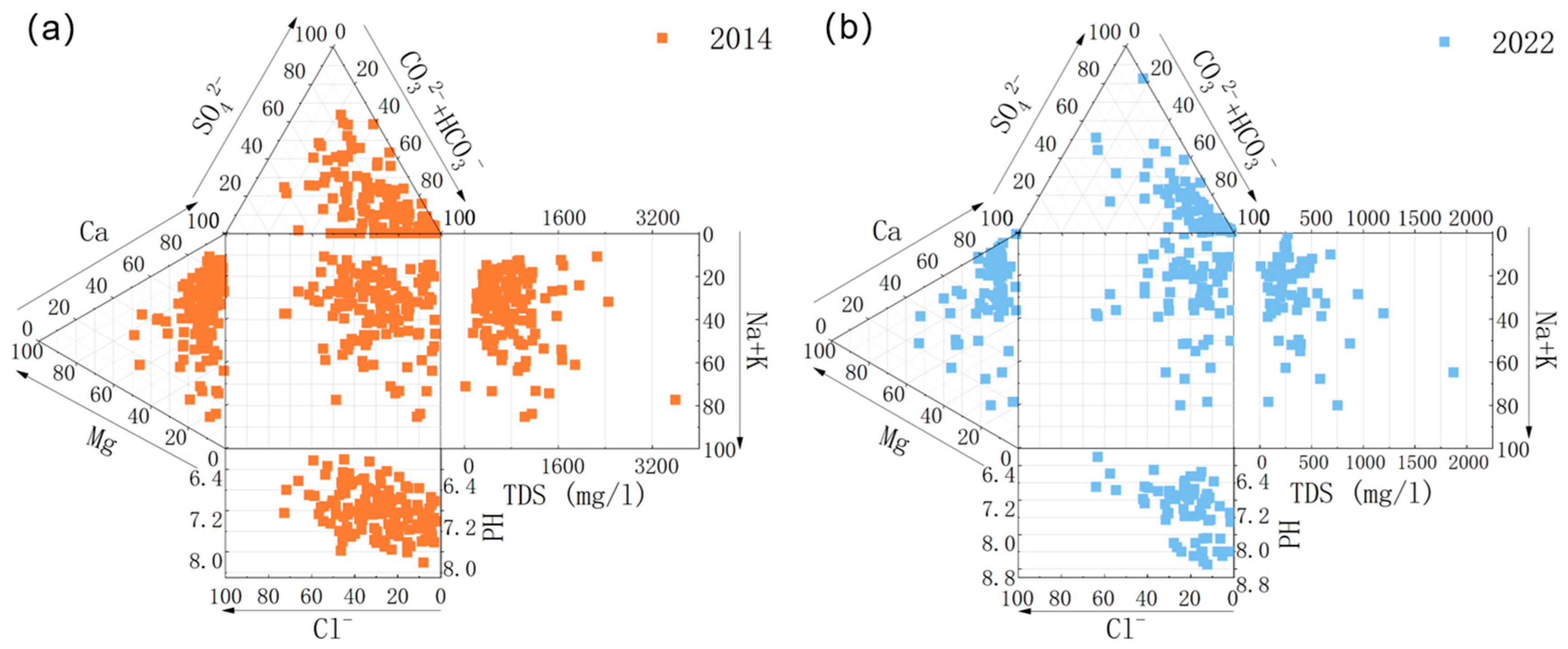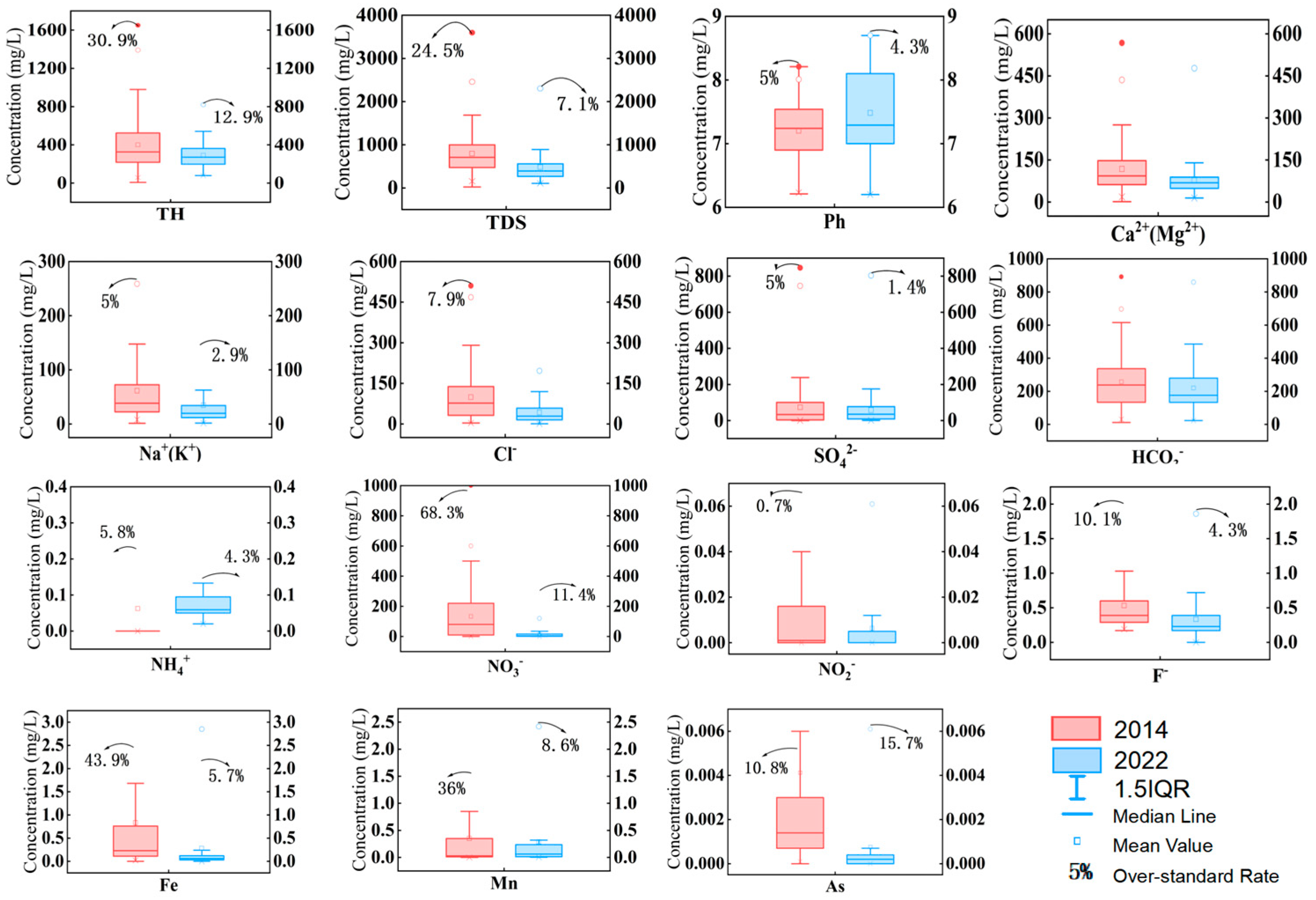 - The dominant hydrochemical type in the study area was determined to be HCO3−–Ca2+, reflecting moderately to weakly alkaline groundwater. No significant shifts in water chemistry were observed between 2014 and 2022, and water hardness remained high. Rock weathering and evaporative crystallization were identified as the primary factors driving hydrochemical evolution. The indicators exceeding their thresholds comprised TH, TDS, pH, Na+, SO42−, NO3−, NO2−, NH4+, F−, Fe, Mn, and As. Although exceedance rates declined and overall water quality improved from 2014 to 2022, geogenic and nitrogenous pollutants remained significant. Notably, NH4+ concentrations rose markedly from 0.06 mg/L in 2014 to 1.26 mg/L in 2022, exceeding the Class III limit (1.0 mg/L).