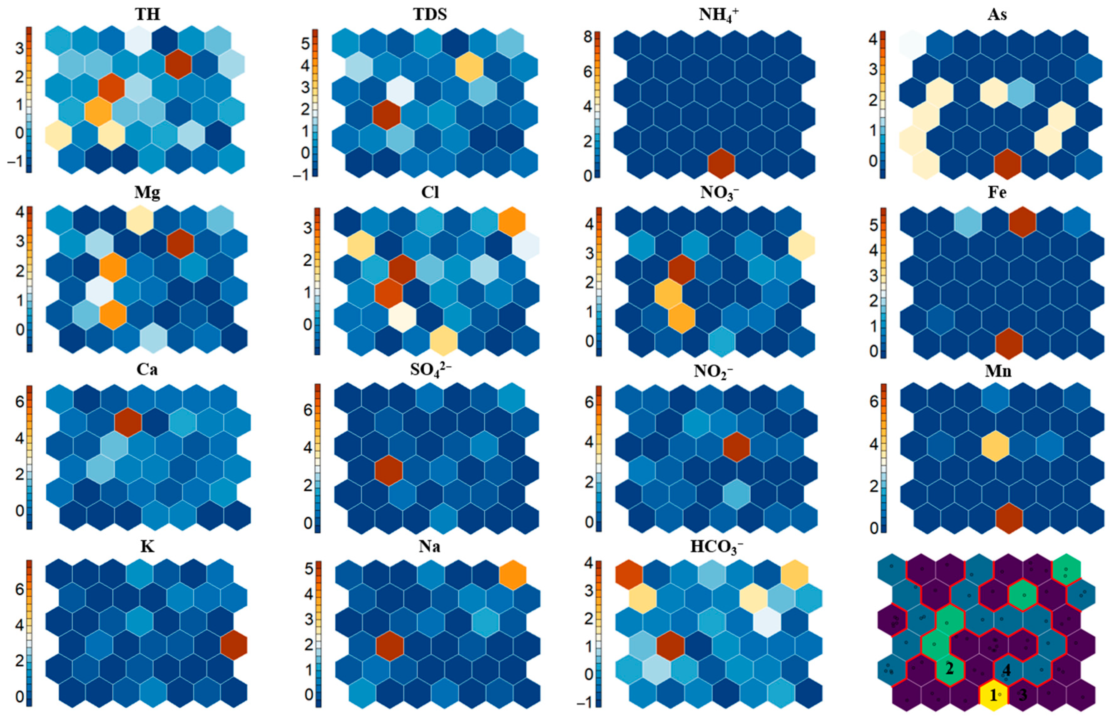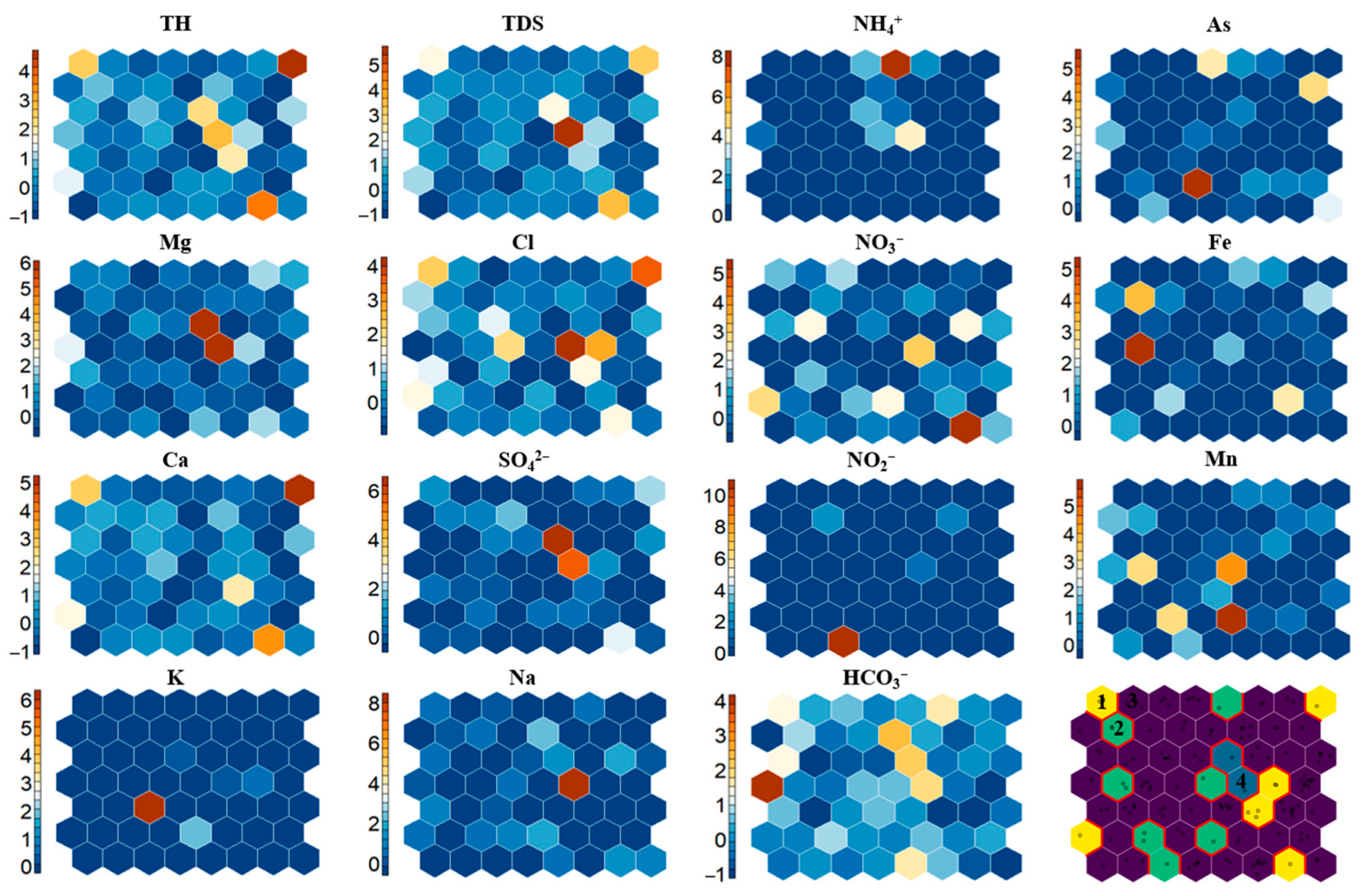 - The study area exhibited a systemic shift from natural weathering dominance to increasing anthropogenic disturbance. The results of the SOM analysis revealed localized high concentrations of As and NH4+ indicative of legacy industrial and agricultural pollution, whereas the Cl− distribution reflected urbanization and de-icing agent inputs.