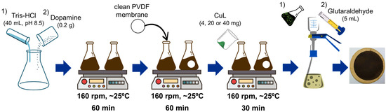 The PVDF membranes were modified according to the methodology developed by Sun et al. (2022), with some adaptations [31]. The arrows correspond to the passage from one stage of the procedure to the next. Initially, the membranes were immersed in ethanol for 60 min to remove surface impurities and plasticizers, followed by rinsing with distilled water for further use. A Tris-HCl buffer solution (40 mmol/L, pH 8.5) was prepared, and the deposition solution was obtained by dissolving 0.2 g of DA in 40 mL of buffer in 250 mL Erlenmeyer flasks while stirring at 160 rpm for 60 min. After 60 min, PDA was formed by the crosslinking of DA, and each membrane was immersed in the polymer-containing medium for an additional 60 min to obtain PVDF/PDA membranes. Different amounts of CuL (mCuL) were added to the PVDF/PDA membranes and stirred for 30 min. The CuL fractions were then filtered onto the membrane surfaces, followed by the filtration of 5 mL of glutaraldehyde. The resulting membranes were designated as PVDF/PDA/CuL-4 (2.89 g/m2), PVDF/PDA/CuL-20 (14.46 g/m2), and PVDF/PDA/CuL-40 (28.92 g/m2), based on the ratio between mCuL and membrane area. Figure 1 shows the steps involved in obtaining PVDF membranes decorated with CuL.