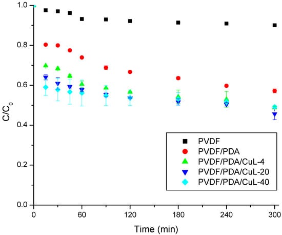 As illustrated in Figure 2, the adsorption of DRX-6BN by the pristine PVDF membrane was only 9.97% after 300 min. In contrast, the PVDF/PDA membrane achieved 19.67% removal within the first 15 min and reached 42.79% at 300 min, indicating that the presence of PDA significantly enhanced dye removal under stirred conditions. This improvement can be attributed to the increased hydrophilicity conferred by PDA, as previously evidenced in Figure S4, which facilitates the diffusion of soluble species towards the membrane surface. Moreover, PDA provides abundant active functional groups that promote stronger interactions between the pollutant and membrane surface [43,44]. The incorporation of the CuL complex further improved the removal efficiency, increasing the adsorption capacity to slightly above 50%.