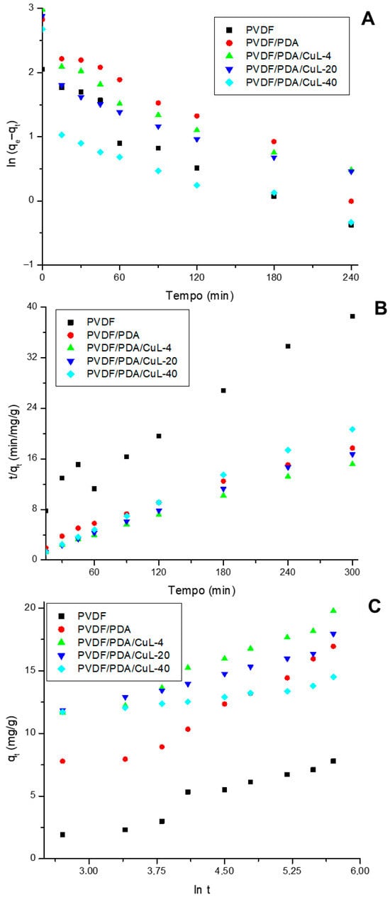 Kinetic fitting of DRX-6BN removal in stirred systems using pristine PVDF, PVDF/PDA, and PVDF/PDA/CuL membranes. The experimental data were treated according to the PFO (A), PSO (B), and Elovich (C) models.