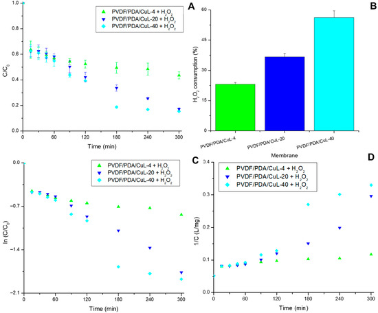 The catalytic activity of the CuL decorated membranes was first evaluated under batch conditions in the presence of H2O2, with the specific aim of assessing the role of CuL in peroxide decomposition. Figure 4 depicts the removal of DRX-6BN, H2O2 consumption, and kinetic model fittings (PFO and PSO) for the PVDF-based membranes. As previously reported, the use of H2O2 alone results in negligible DRX-6BN removal [21].