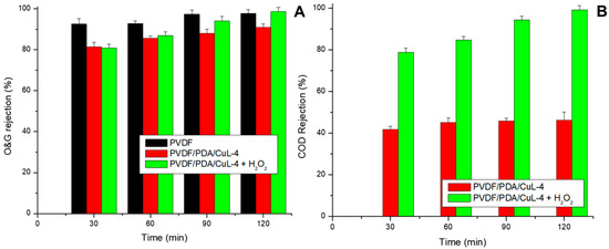 As depicted in Figure 5, O&G rejection continuously increased from 0 to 120 min, particularly for the PVDF/PDA/CuL membrane, both in the presence and absence of H2O2, reaching 97.66 ± 1.92%, 91.02 ± 1.58%, and 98.67 ± 1.96% for the pristine membrane and those containing CuL without and with H2O2, respectively. However, COD rejection was limited to 38.52 ± 2.07% for the pristine membrane after 120 min, while nearly complete removal (~100%) was achieved with the CuL decorated membrane in the presence of H2O2 within the same period, surpassing 80% after 60 min. These results clearly demonstrate the ability of CuL to catalyze H2O2 decomposition and enhance the oxidative removal of organic contaminants [21].