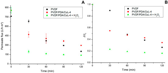 Permeate flux (A) and J/J0 for the pristine and CuL decorated PVDF membranes (B) during oily wastewater treatment. Conditions: pH = ~6.0, CO&G0 = 100 ± 5 mg/L, CH2O20 = 20 mg/L (in the oxidation tests), Vemulsion = 1.5 L, T = 25 °C, P = 1 bar.