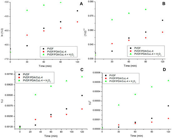 Graphs associated with the Hermia models applied to the treatment data with pristine and CuL decorated PVDF membranes: BTP (A), OP (B), BPP (C), and e TF (D).