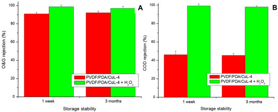 O&G rejection (%) (A) and COD removal (%) (B) by CuL decorated PVDF membranes as a function of storage time. Conditions: pH = ~6.0, CO&G0 = 100 ± 5 mg/L, CH2O20 = 20 mg/L (in oxidation tests), Vemulsion = 1.5 L, T = 25 °C, P = 1 bar.