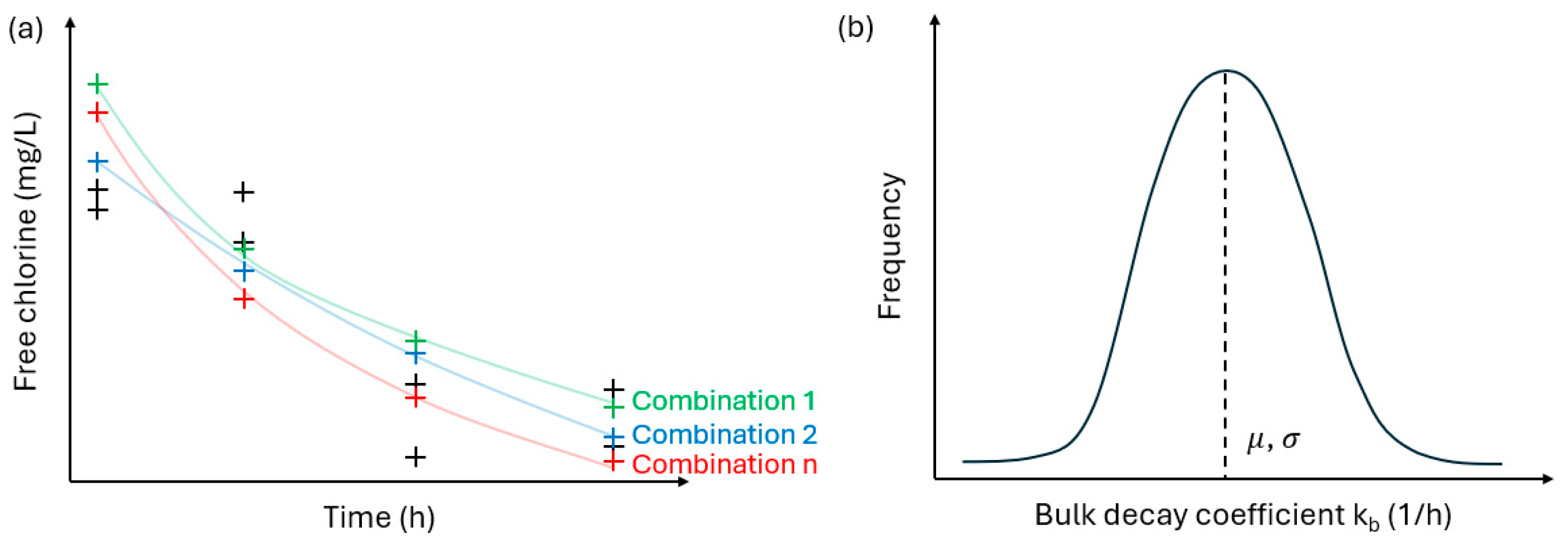 Therefore, the aim of this paper is to develop a methodology that statistically fits chlorine’s bulk decay coefficient (mean value and standard deviation) at water supply systems, tracking uncertainty along the process. Following common practice in the field, the method relies on bottle test data, which in this case are fitted to a first-order bulk decay model; however, it could similarly be adapted to alternative models. The mean value of