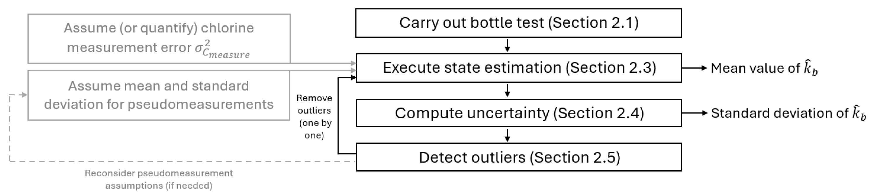 Figure 2 (which includes measurement replication, state estimation, uncertainty quantification, outlier detection, and revision of pseudomeasurement assumptions) is essential for processing bottle test data from this type of water source. We must acknowledge that, based on the results, it seems that very low TOC values seem to be associated with very low bulk coefficients (as in treatment works C). This implies that chlorine will decay slowly through the network, and so the risk of falling below the recommended 0.2 mg/L free chlorine threshold will be low. The proposed methodology enables the identification of this type of water source by systematically computing the uncertainty of the bulk decay coefficient.