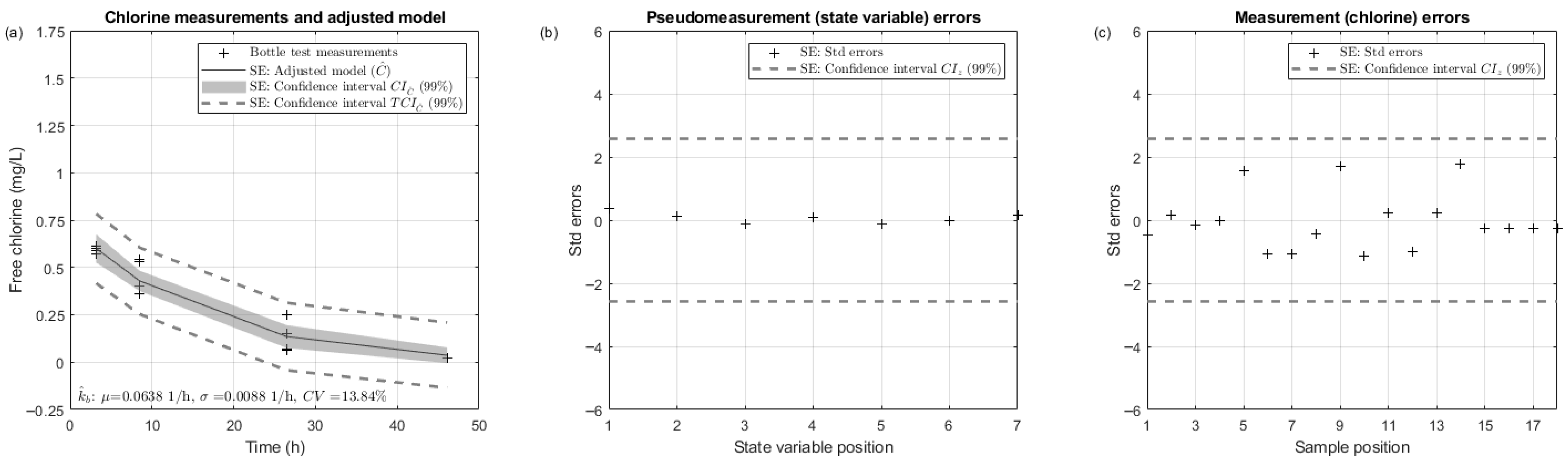 Table 1). This occurs because chlorine measurements (and the assumed model) help reduce the standard deviation of the pseudomeasured initial chlorine concentration (and the rest of the state variables) through the state estimation process. The mean of the final concentration (according to the model) and model errors tend to be zero, with a standard deviation consistent with the assumed 0.01 mg/L value (
