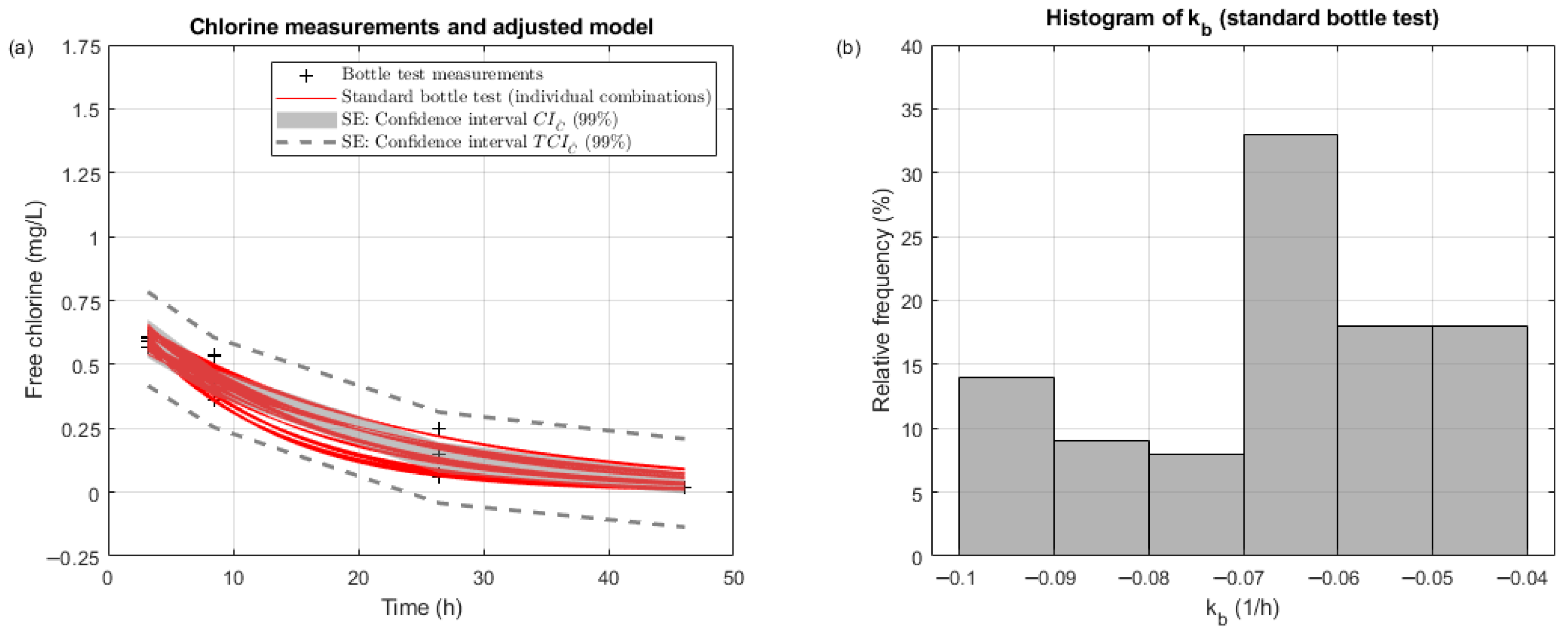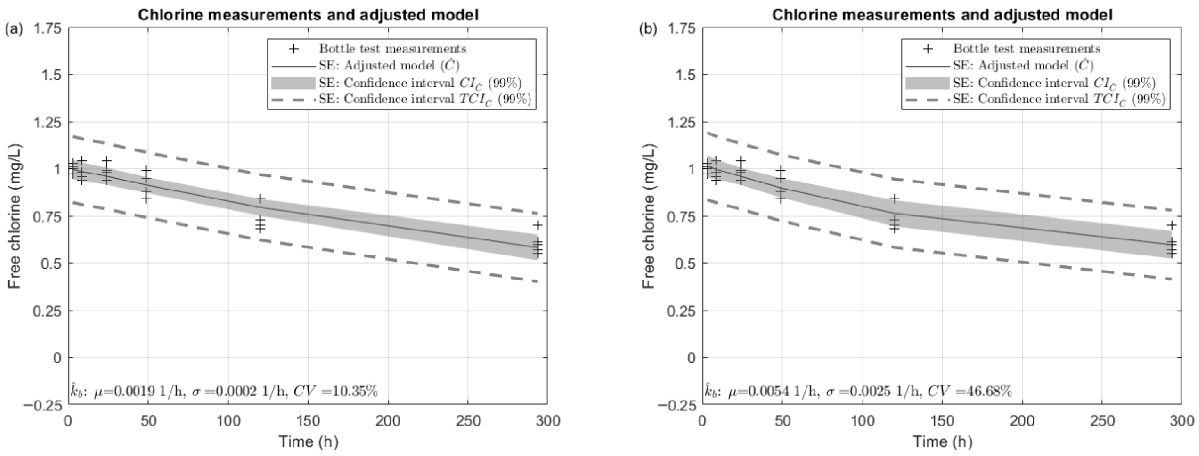 Figure 5b). This change in assumption also implies a significant increase in the bulk decay coefficient standard deviation (from 0.0004 to 0.0026 1/h) and CV (from 9.30 to 19.80%). However, it is the most realistic approach given that chlorine concentrations during the bottle test do not reach 0 mg/L.