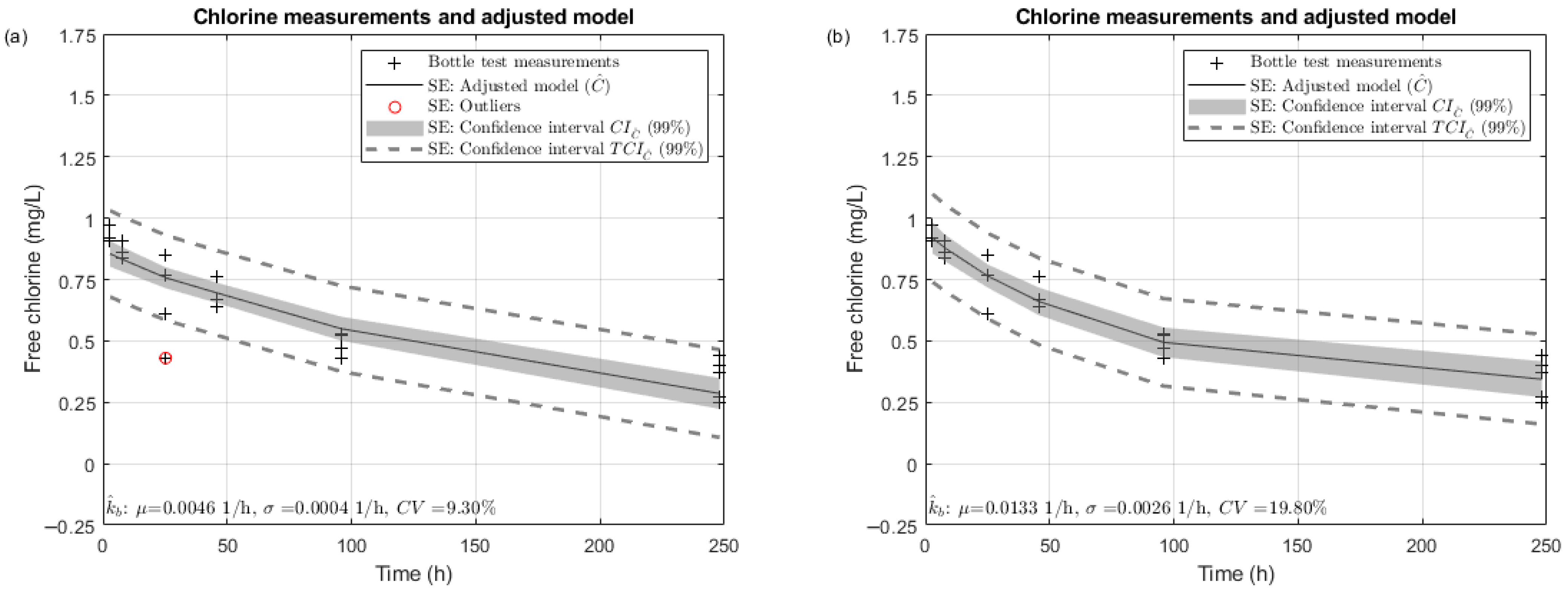 Table 6 provides a summary of SE results for bottle tests C, considering an increased standard deviation of 0.5 mg/L for the final chlorine concentration in all cases. Only one outlier has been removed for test C-E03 (measurement 13, see