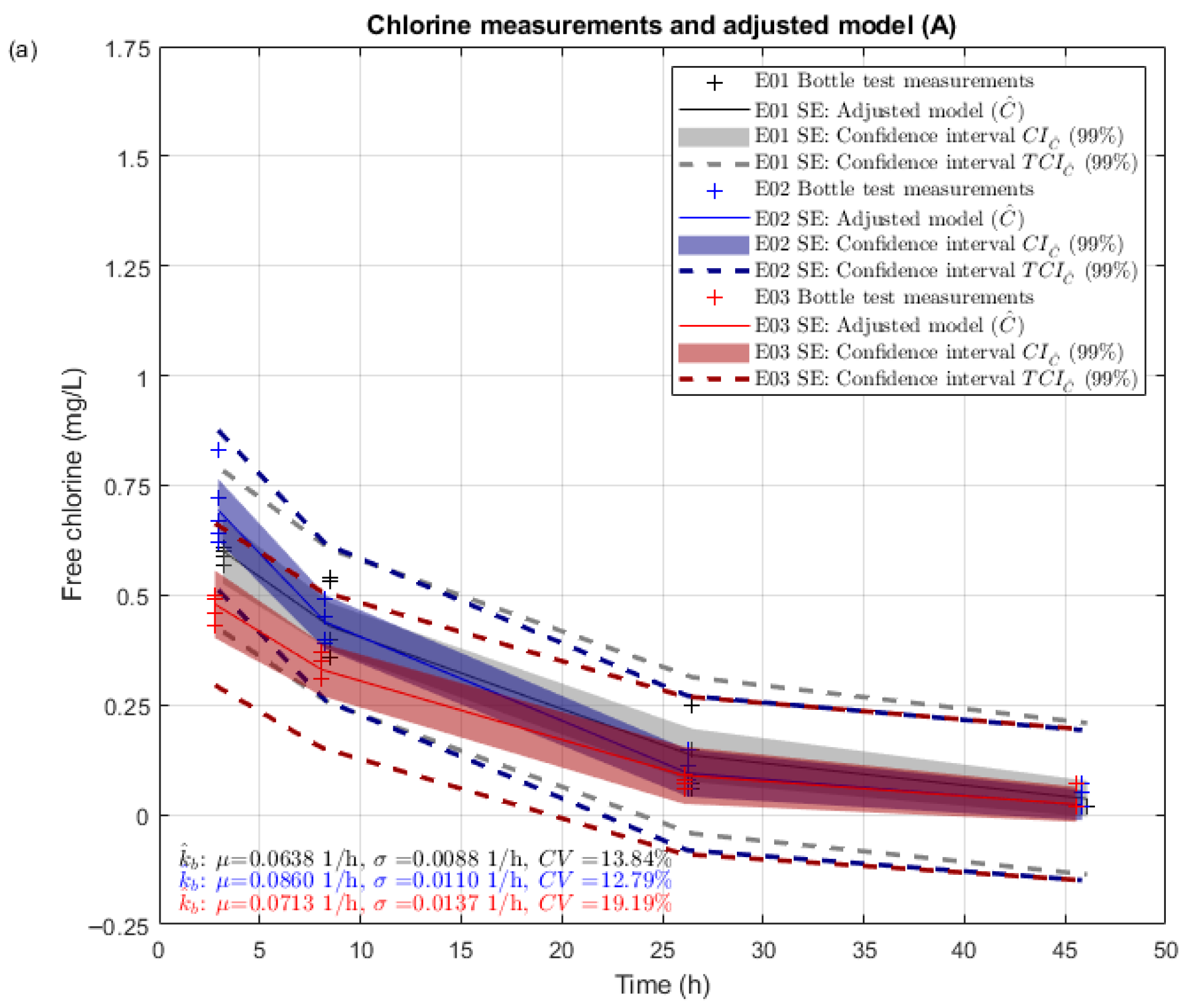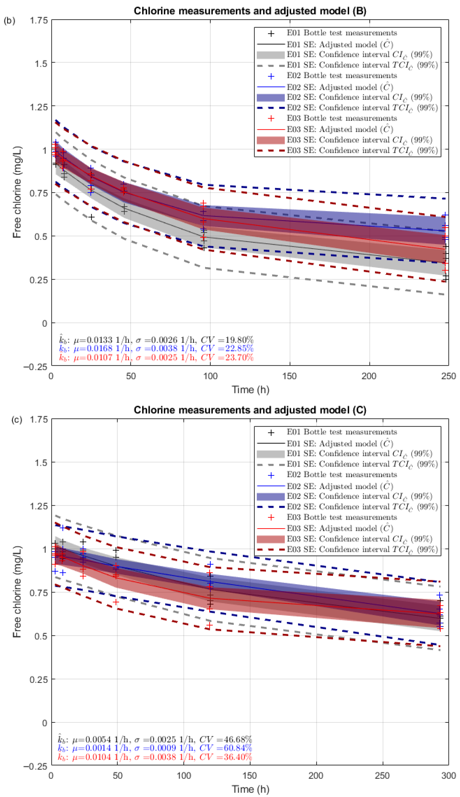 SE results) considering triplicate bottle tests are 15.27%, 22.12% and 47.97% for sources A (surface water) and B/C (groundwater), respectively. The CV of grab sample B is higher than A mainly because of the need to increase the assumed standard deviation for the final concentration of the model, a decision that comes determined by chlorine measurements evolution over the bottle test, which do not tend to zero in the time window considered. The CV of grab sample C is even greater due to the low repeatability of bottle tests in water samples with low content of organic matter.