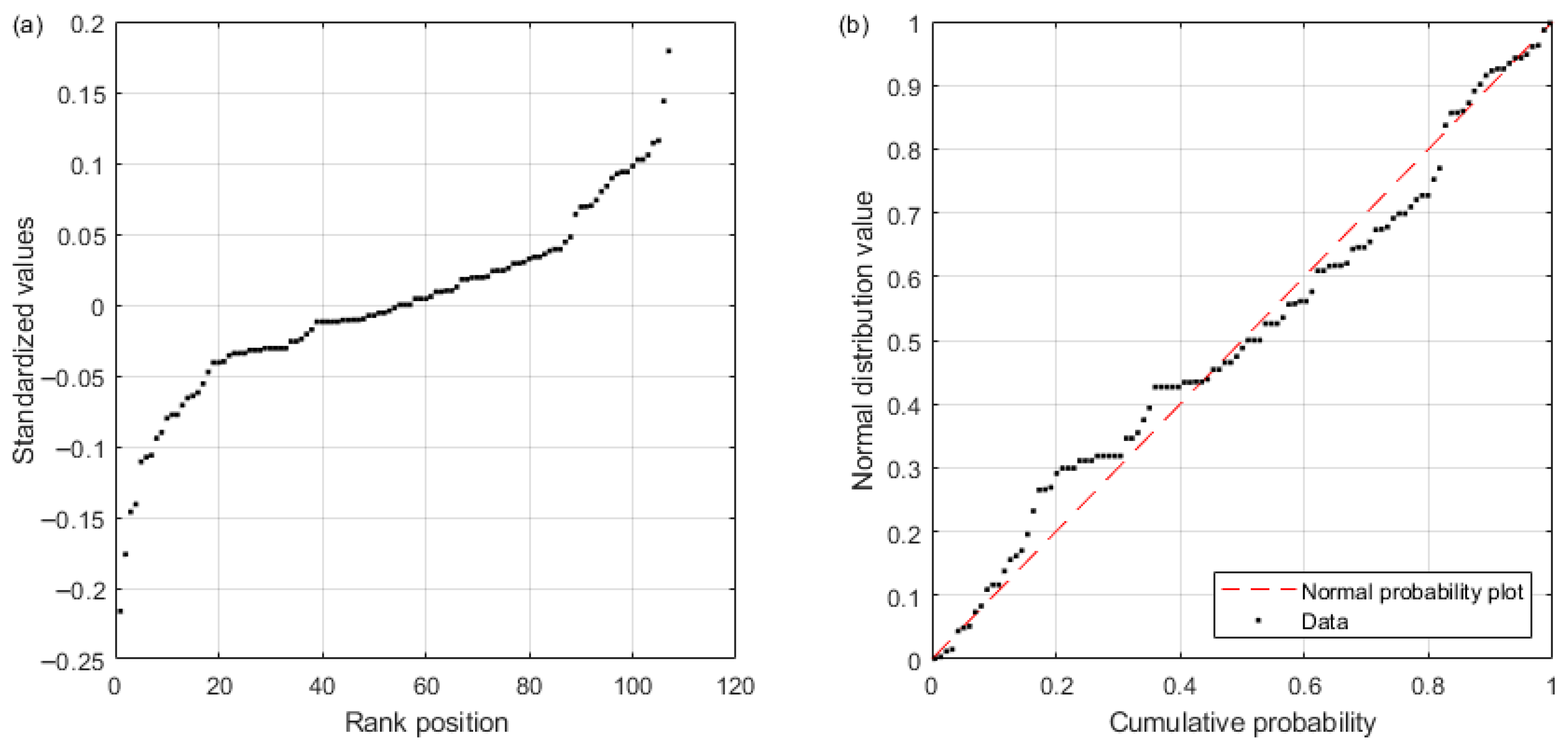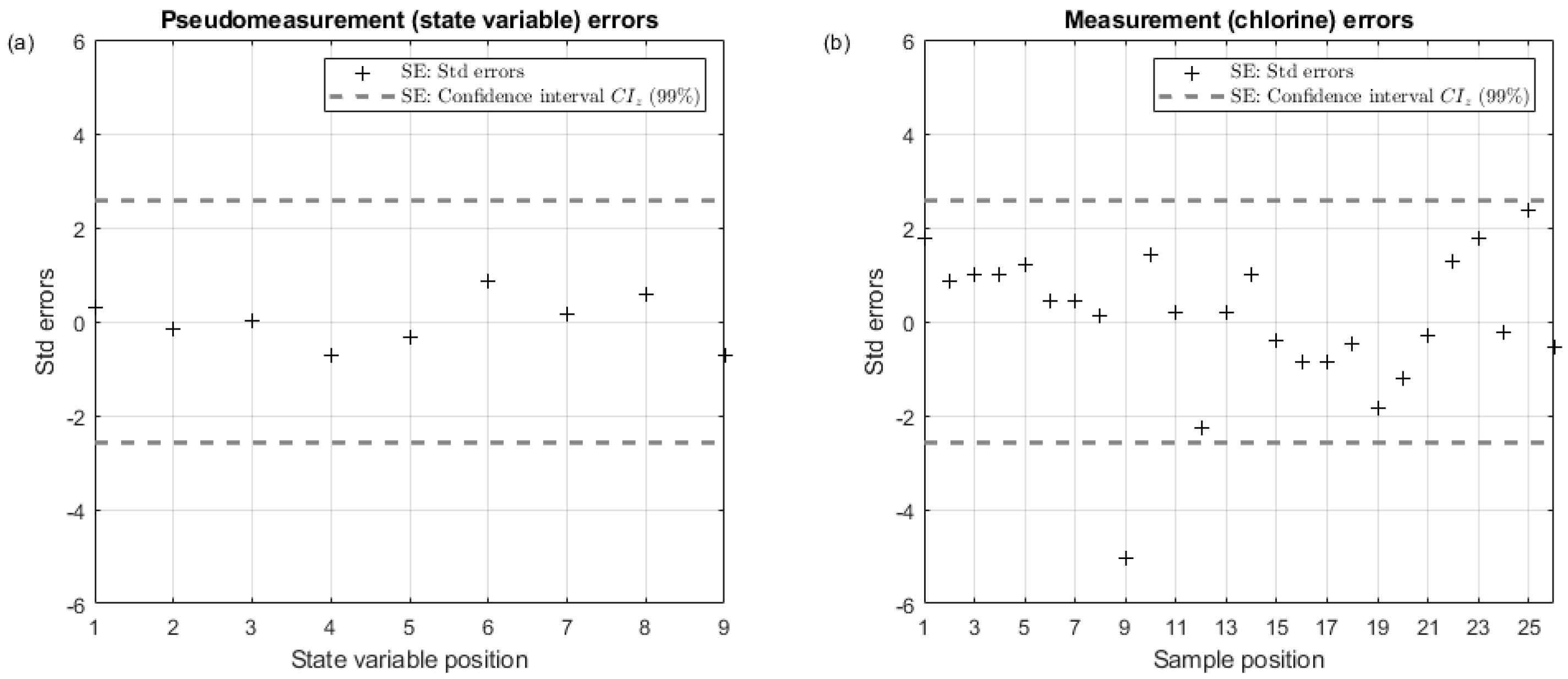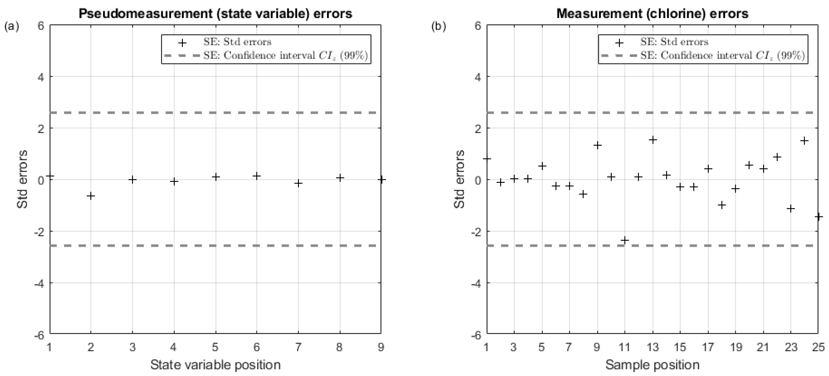 Figure 3b shows the standardized errors of pseudomeasurements (i.e., state variables) as provided by Equation (12). The threshold value for outlier detection in this case (99%