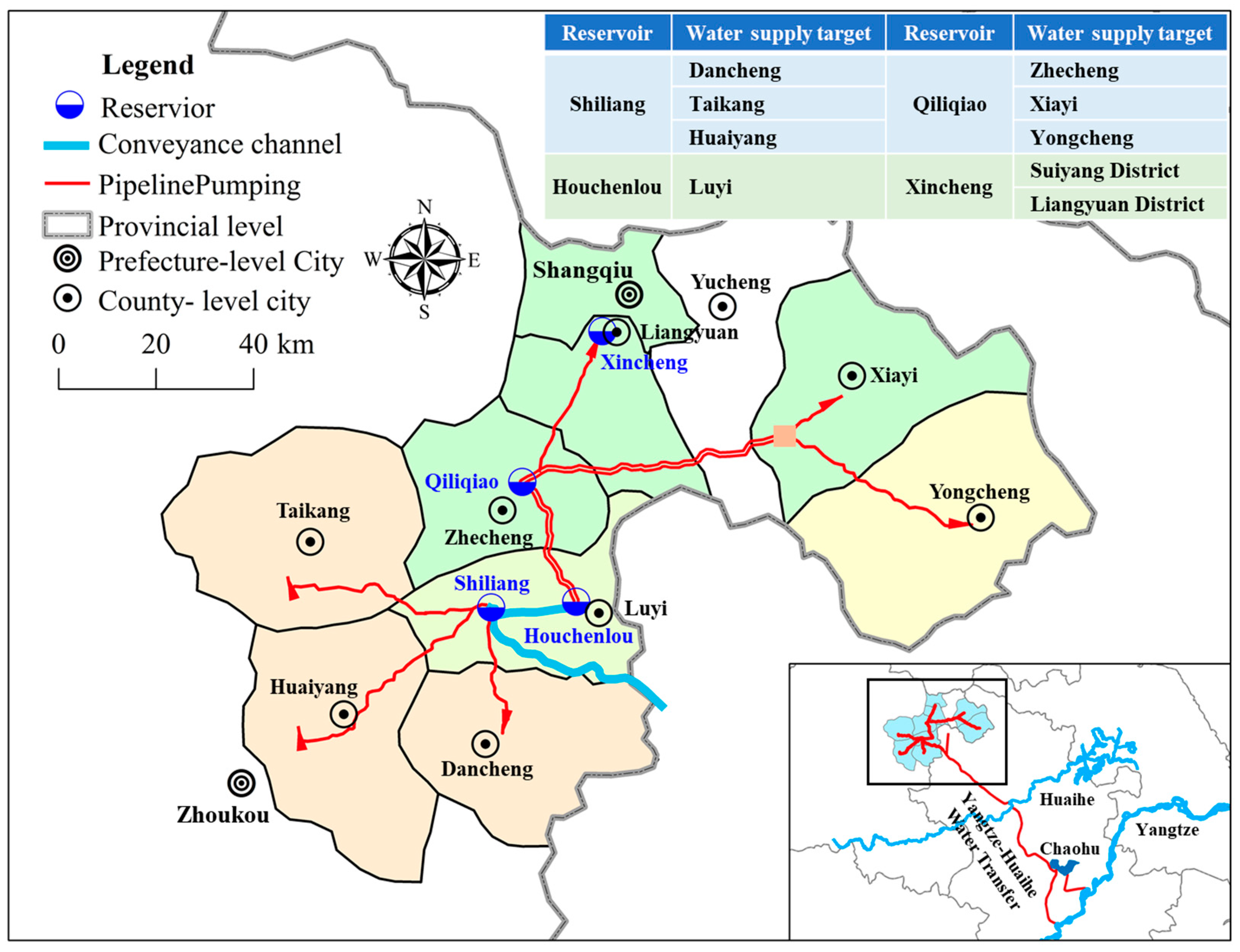 The Yangtze-to-Huaihe Water Diversion Project is an inter-basin water transfer initiative focused on optimizing regional water resource distribution and enhancing comprehensive utilization, with a primary emphasis on urban and rural water supply. Stretching from south to north, the project consists of three key components: (1) diverting water from the Yangtze River to Chaohu Lake, (2) establishing a hydraulic link between the Yangtze and Huaihe River basins, and (3) conveying water northward from the Yangtze River. Administratively, the project can be divided into two components: the Henan Reach and the Anhui Reach. This study focuses on the Henan Reach. The water conveyance system supplies nine administrative regions through the Qingshui River and Luxin River. The service areas comprise Dancheng, Taikang, Huaiyang, Liangyuan District, Suiyang District, Yongcheng, Xiayi, Zhecheng, and Luyi. The system’s water flow is regulated by four reservoirs: Shiliang, Houchenlou, Qiliqiao, and Xincheng. Figure 1 illustrates the geographical layout and the water supply area. For a comprehensive understanding of regional water demand characteristics, Table 1 summarizes the key socioeconomic information for each water supply target, including population, industrial value-added. Table 2 provides detailed data on water demand.