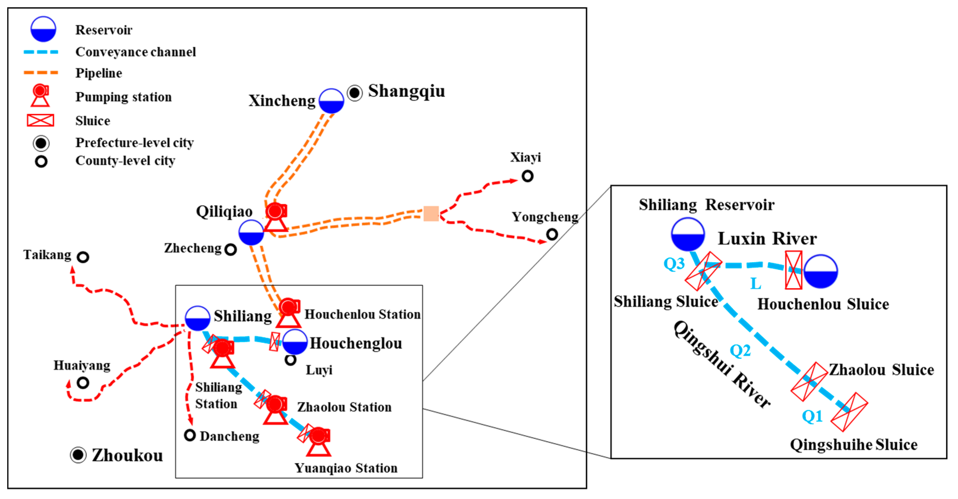The Henan Reach features a complex engineering layout comprising two water conveyance channels, five pumping stations, and four regulating reservoirs. Delineated by key control sluices, these channels are divided into four primary segments: (1) Qingshuihe Sluice–Zhaolou Sluice (Q1), (2) Zhaolou Sluice–Shiliang Sluice (Q2), (3) Shiliang Sluice–Shiliang Reservoir (Q3), and (4) Shiliang Sluice–Houchenlou Sluice (L). The first three segments are located along the Qingshui River, where the Qingshuihe Sluice, Zhaolou Sluice, and Shiliang Reservoir serve as major regulation nodes. In contrast, the fourth segment L lies on the Luxin River, connecting to Houchenlou Sluice and Houchenlou Reservoir. The schematic layout of the entire system, highlighting the spatial arrangement of channels, sluices, and reservoirs, is shown in Figure 2, and the corresponding basic information are summarized in Table 3.