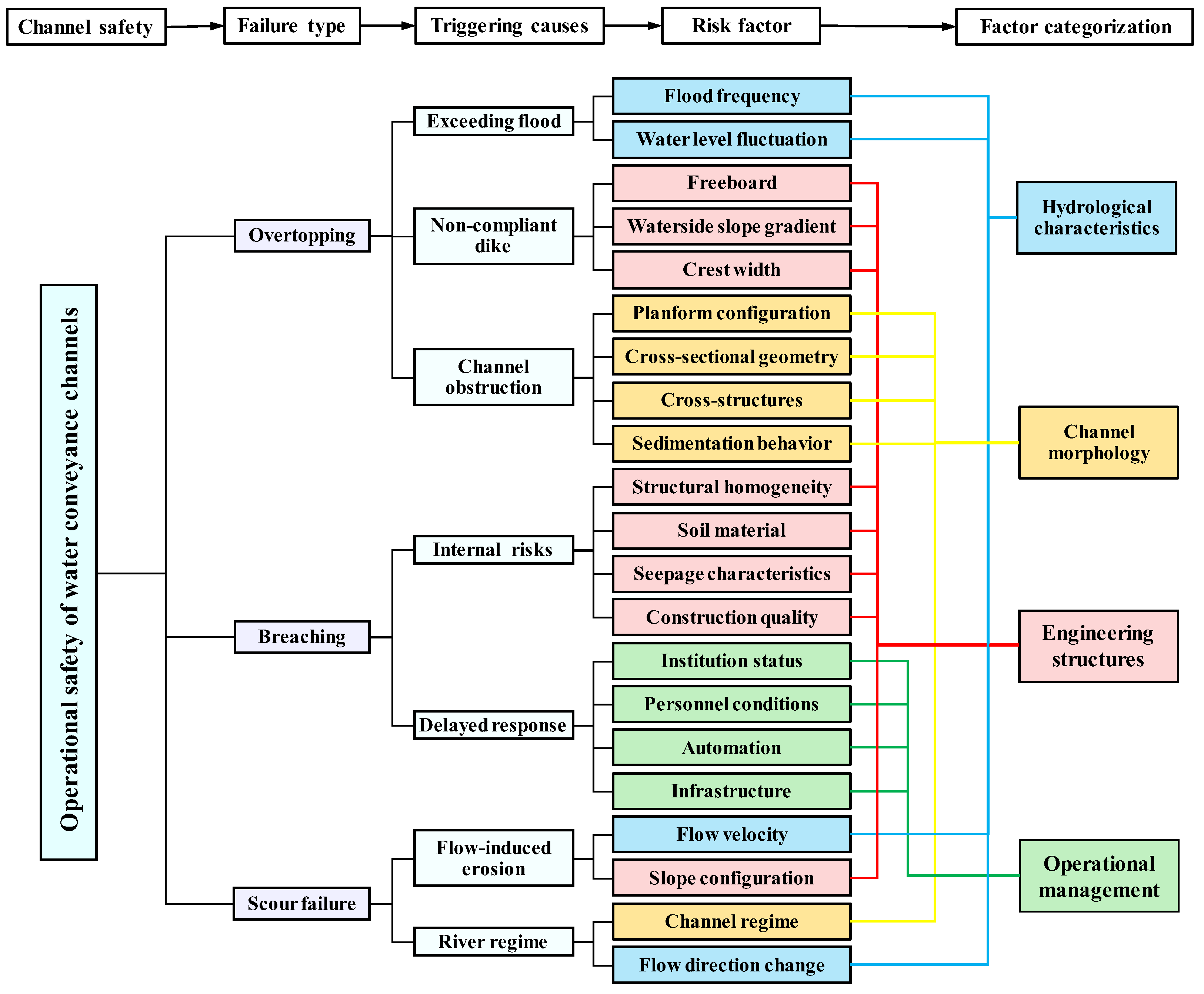 To systematically identify and organize the relevant risk factors, this study employs the CRDM process illustrated in Figure 3. The process encompasses five components: channel safety, failure types, triggering causes, associated risk factors, and factor categorization.
