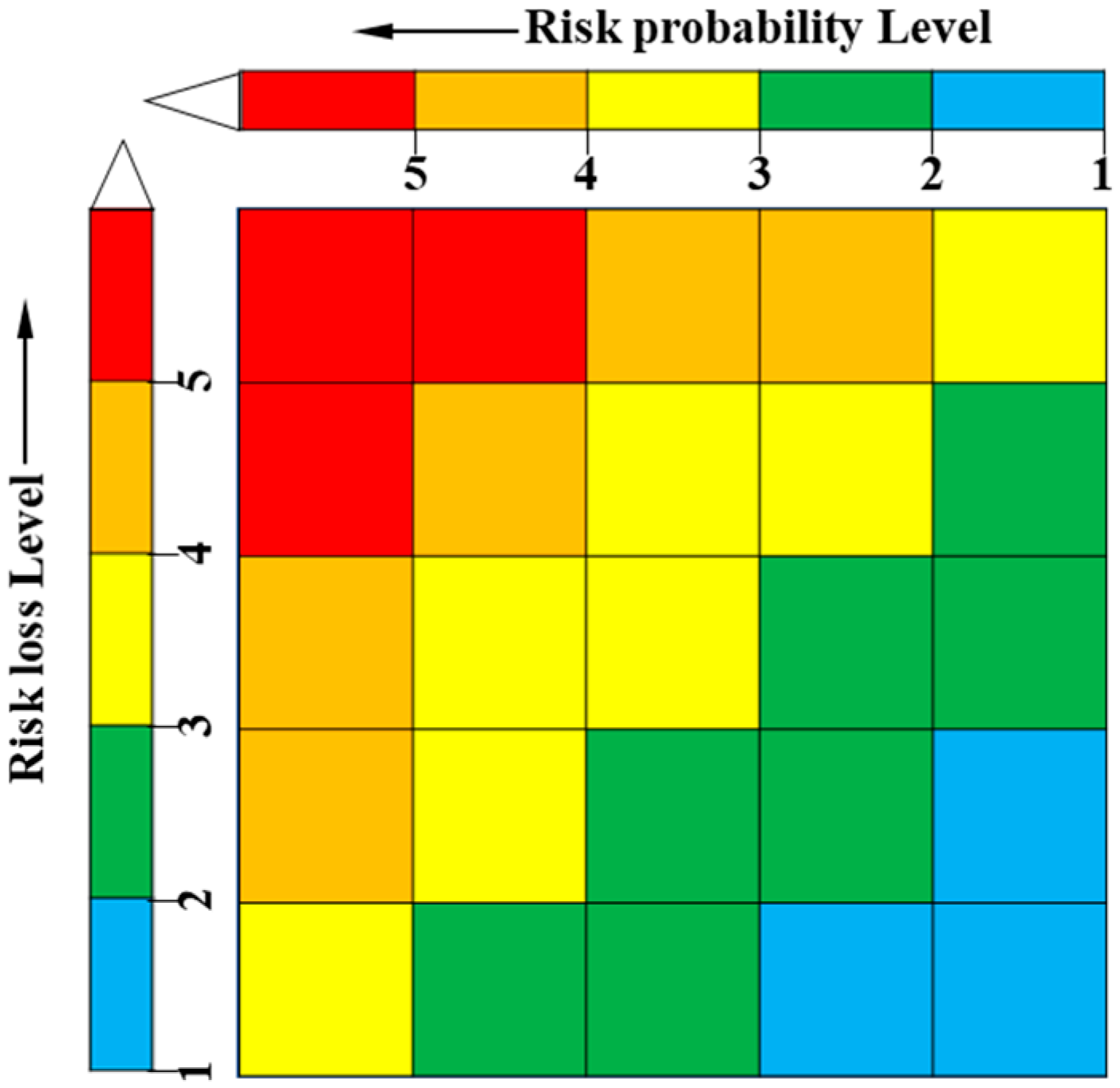 A two-dimensional risk matrix, integrating the risk probability A and the risk loss S, is proposed to determine the comprehensive operational safety risk classification for water conveyance channels, as shown in Figure 5. The consistent color gradient from blue to red indicates increasing risk severity, representing low, relatively low, moderate, relatively high, and high risk levels, respectively.