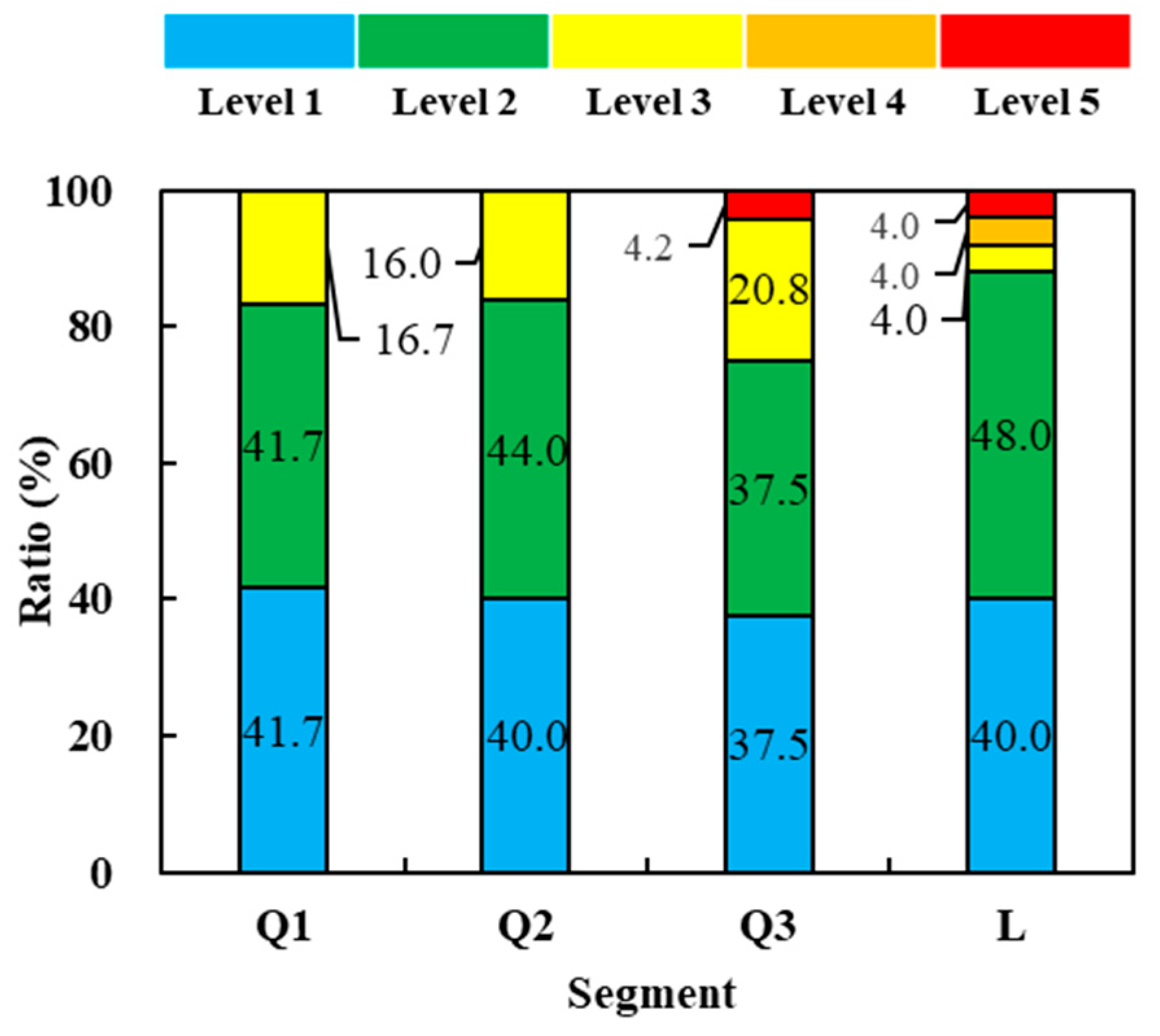 Figure 6 presents the operational safety risk probabilities for individual indicators across the studied segments, while Figure 7 illustrates the distribution of their risk levels. As shown in the individual indicator results (Figure 6), for the four segments Q1, Q2, Q3, and L, the number of Level 1 indicators is 10, 10, 9, and 10, respectively; Level 2 indicators are 10, 11, 9, and 12; Level 3 indicators are 4, 4, 5, and 1; Level 4 indicators are 0, 0, 0, and 1; and Level 5 indicators are 0, 0, 1, and 1. The vast majority of individual indicators are classified as either Level 1 or Level 2, indicating generally low risk across the system. As shown in the distribution (Figure 7), Level 1 and Level 2 indicators predominate across the four segments. The proportions of Level 1 indicators are 41.7%, 40.0%, 37.5%, and 40.0%, respectively, while those of Level 2 indicators are 41.7%, 44.0%, 37.5%, and 48.0%. Level 3 indicators constitute a moderate share, ranging from 4.0% to 20.8%. In contrast, higher-risk levels are rare: Level 4 occurs only in reach L (4.0%), corresponding to the crossing structure count (D3); Level 5 is observed exclusively in reaches Q3 and L, each at 4.0%, attributed to D3 in Q3 and foundation seepage characteristics (D10) in L.