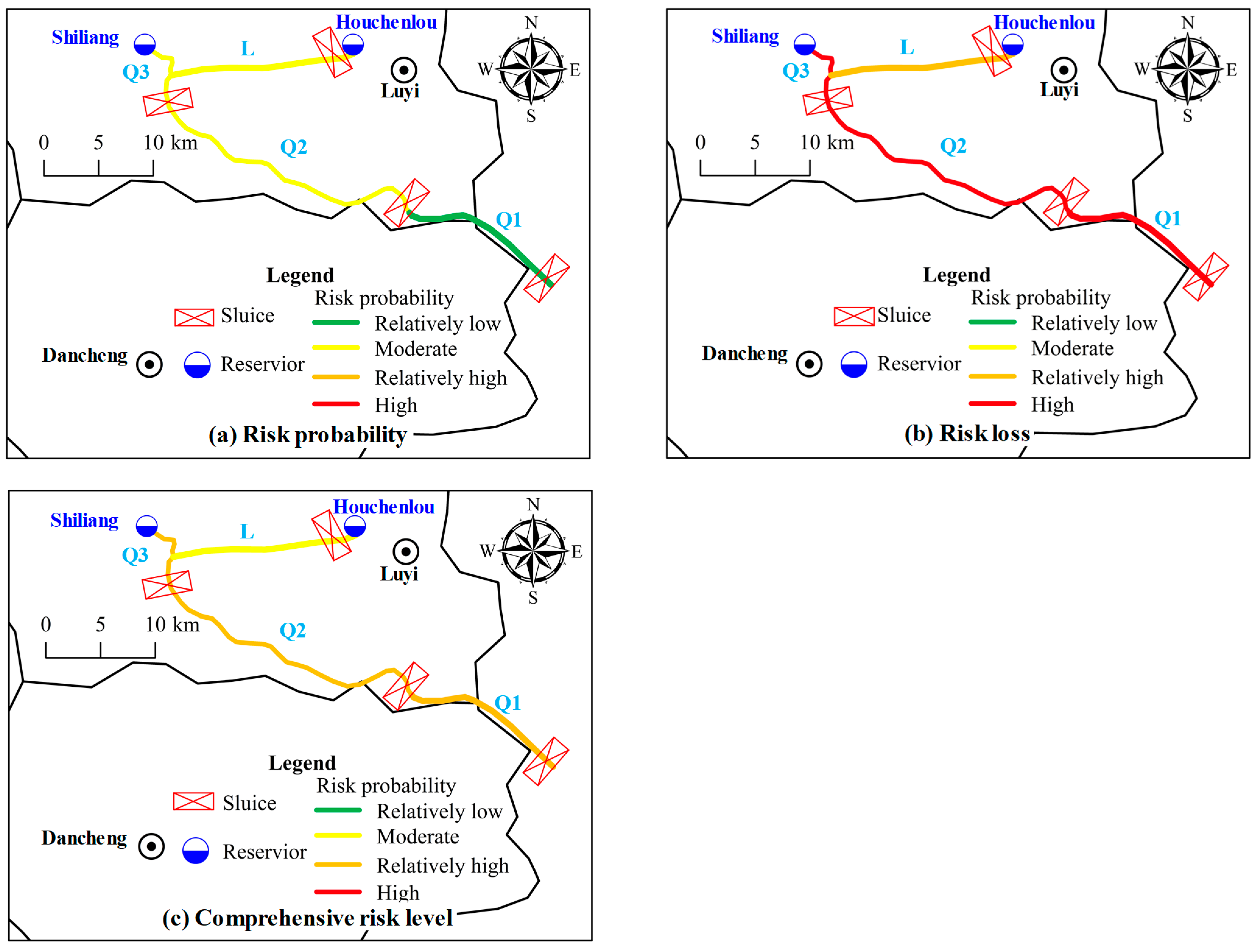 The results reveal that the risk probabilities for Q1, Q2, Q3, and L are classified as relatively low, moderate, moderate, and moderate, respectively (Figure 8a), whereas their corresponding risk losses are assessed as high, high, high, and relatively high (Figure 8b). Consequently, the comprehensive risk levels are evaluated as relatively high for Q1, Q2, and Q3, and moderate for reach L (Figure 8c). A notable discrepancy can be observed between the single dimensional risk probability assessment (Figure 8a) and the comprehensive risk assessment (Figure 8c). While the former shows no discernible spatial pattern, the latter exhibits a distinct longitudinal trend: risk levels generally decrease along the conveyance path from upstream to downstream. This discrepancy arises because comprehensive assessment explicitly accounts for both the likelihood of failure and the severity of its consequences. In particular, risk loss magnitude is strongly correlated with the water supply capacity and its position within the upstream–downstream network. Reaches with larger supply capacities, such as those along the Qingshui River, serve more extensive industrial, agricultural, and municipal demand zones, resulting in greater economic and social impacts when failure occurs. Moreover, due to the serial (i.e., cascading) connectivity of water conveyance system, a failure in any upstream segment propagates downstream, disrupting water delivery across all subsequent reaches and amplifying cumulative consequences. Consequently, the combined effects of water transmission burden and the system’s inherent sequential configuration leads to significantly higher operational risk in the Qingshui River reaches compared to the Luxin River. This finding aligns well with actual operational experience and observed vulnerability patterns. Importantly, it demonstrates that traditional probability only assessments may underestimate risk in high-consequence zones, particularly in upstream segments with large service areas. Thus, incorporating risk loss, which quantified through economic, social, and systemic impact indicators, enables a more realistic and operationally meaningful representation of overall risk.