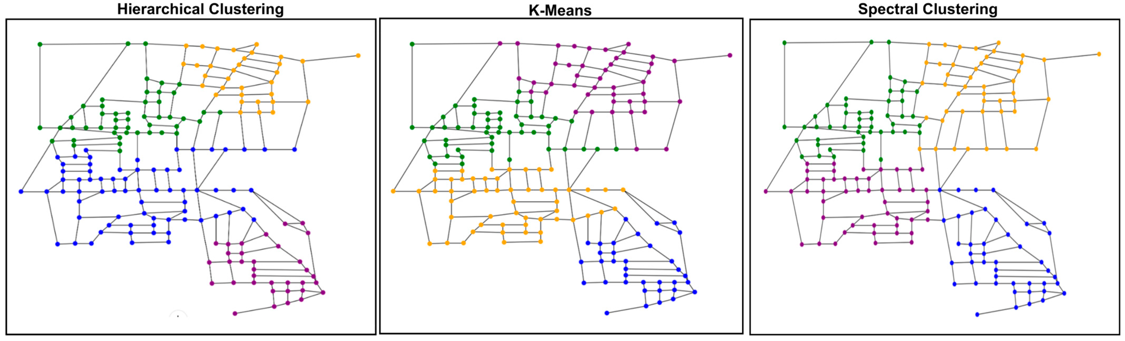 Clustering Algorithms. Three clustering algorithms were applied to partition the network into four DMAs: k-means clustering, spectral clustering, and hierarchical clustering. Each algorithm uses a different approach to divide the network and produces different results in terms of node distribution and pipe structure. K-means clustering is a distance-based algorithm that subdivides the nodes into k clusters by minimizing the variance within each cluster. In this analysis, the algorithm was applied using the geographic coordinates of the nodes to group them into four clusters based on proximity. This approach provided an initial partition of the network, where each cluster contained geographically close nodes, and the distances between nodes in each cluster were minimized. Spectral clustering utilizes the eigenvalues of the network’s adjacency matrix to partition nodes into clusters. This method is sensitive to the connectivity of the network, rather than relying solely on physical distances between nodes. For the Parete water network, spectral clustering grouped nodes that were closely connected in terms of the pipe network, producing clusters that reflected the structural connectivity of the system. Hierarchical clustering builds a tree-like structure by iteratively merging or splitting clusters.