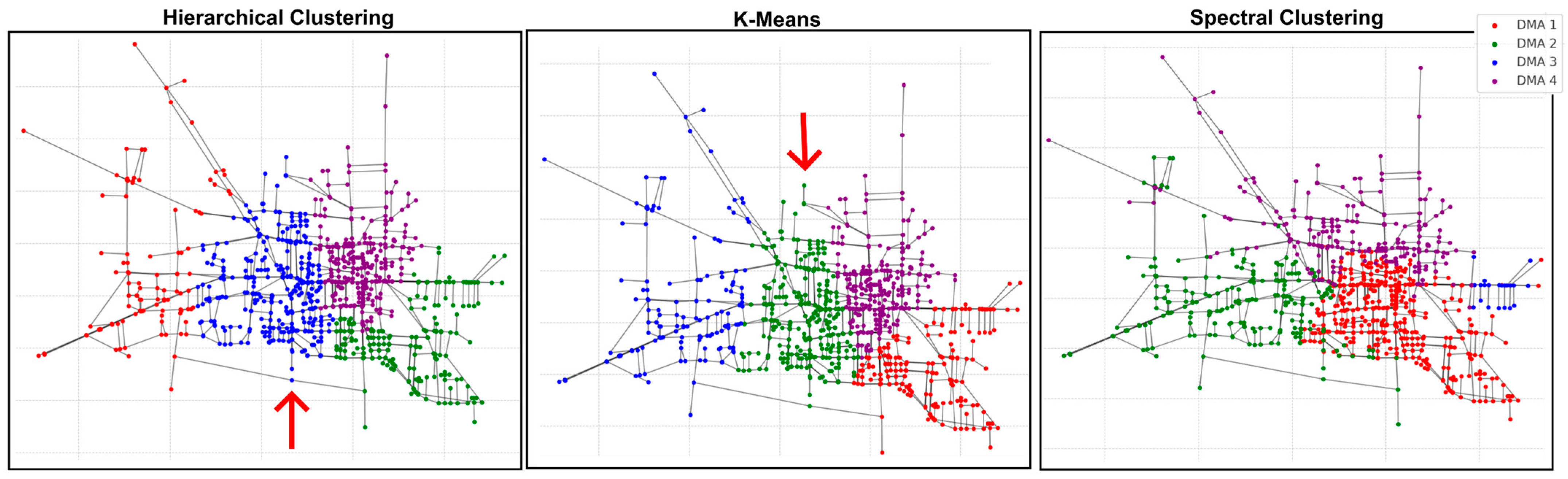 The partitioning of WDNs into DMAs offers multiple advantages, including but not limited to (1) enhanced leakage management, as leaks and losses can be detected and isolated more efficiently; (2) scalability, where smaller units allow for the optimization of each DMA individually without disrupting the entire network; (3) system simplification, as managing smaller clusters is easier than overseeing the entire distribution system; and (4) improved water quality control [