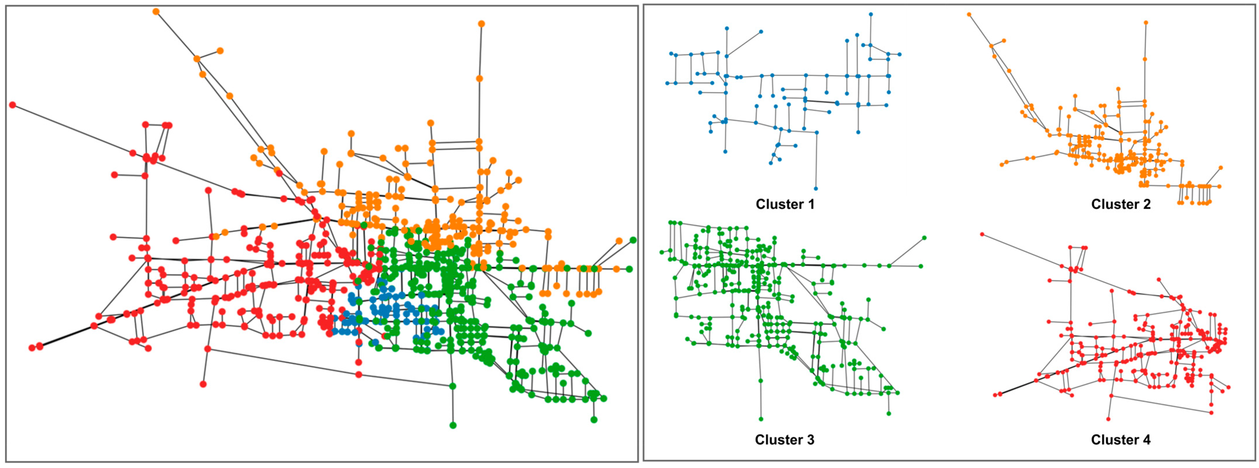 The network was then represented as a graph where nodes corresponded to junctions and reservoirs, and edges represented the pipes connecting these nodes. This graph model allowed for the application of clustering algorithms.