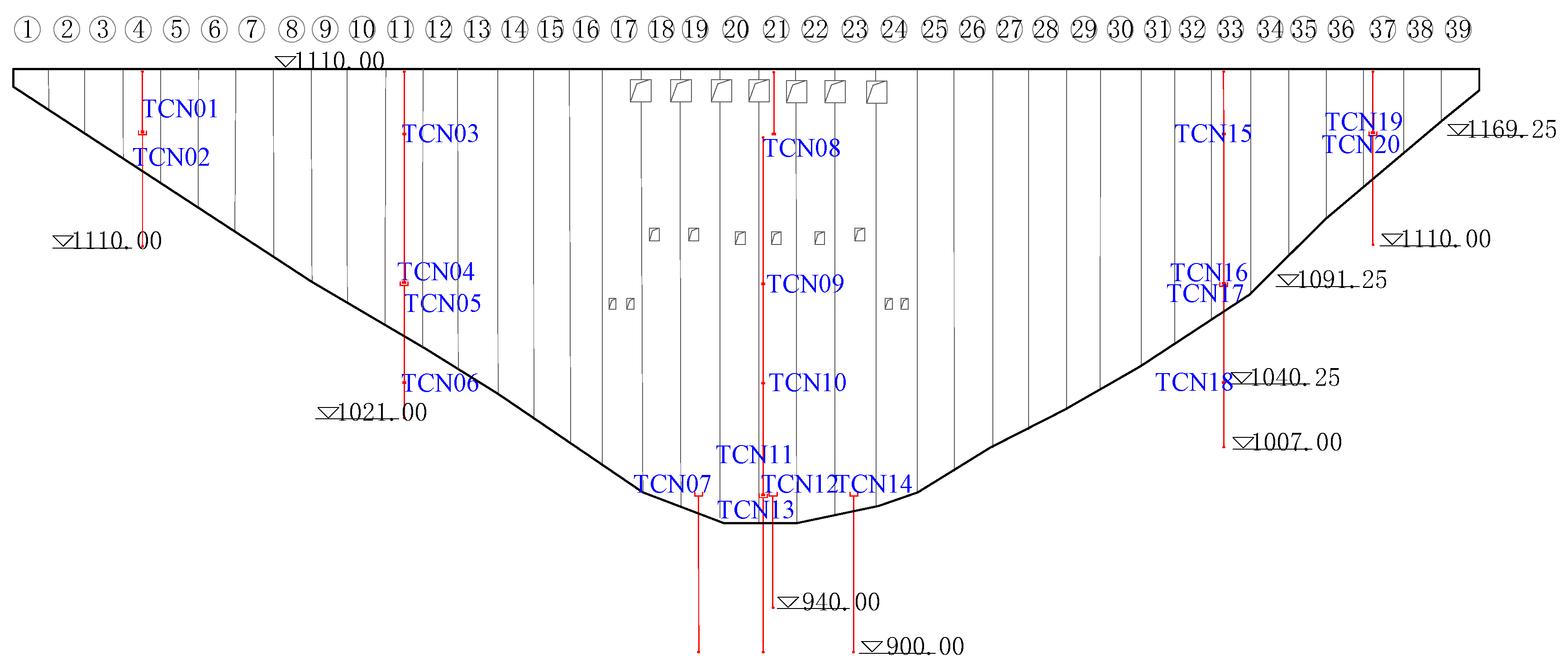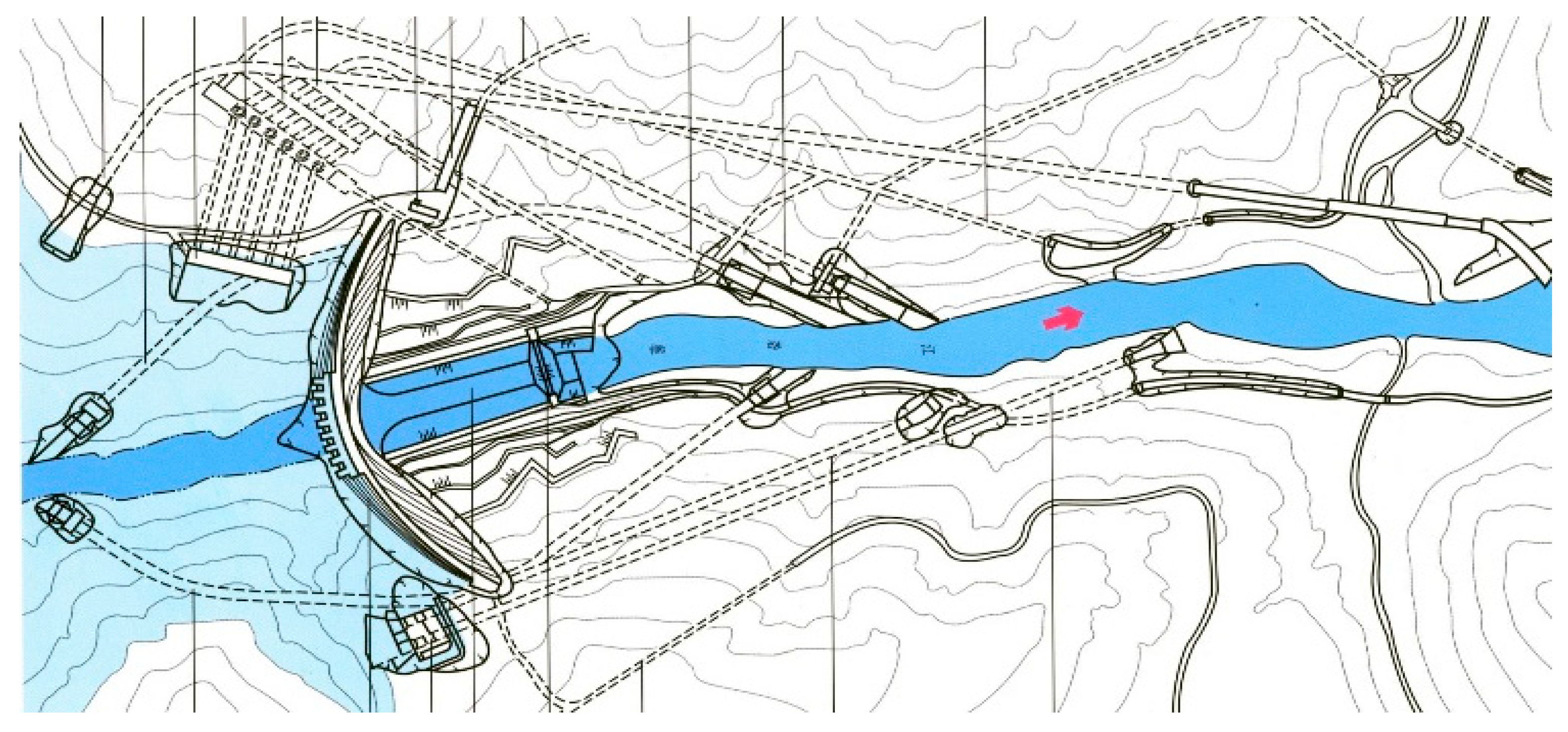 The investigated concrete arch dam has a maximum height of 280 m and is divided into multiple structural sections. The hydraulic station is an annual regulating reservoir, and its plan layout is shown in Figure 6 and Figure 7. The dam body incorporates an internal system comprising approximately 100 horizontal galleries, 20 foundation galleries, and 100 branch galleries, which facilitate inspection, drainage, and structural monitoring. The reservoir is primarily intended for hydropower generation, operating at a normal water level of 1200 m and providing a total storage capacity of about 1 × 108 m3.