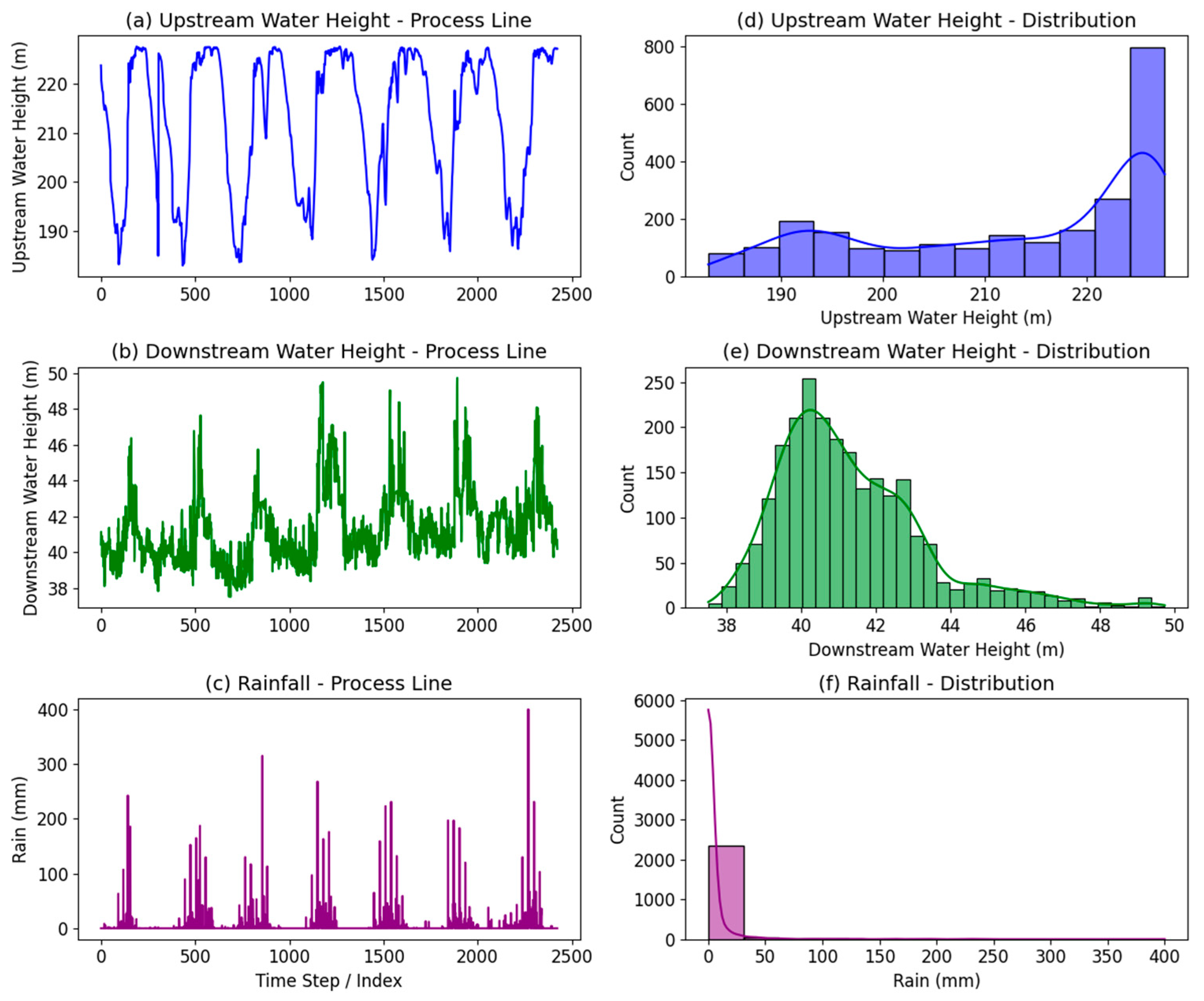 Figure 8 presents the time-series trends and corresponding statistical distributions of three key hydraulic variables, including the upstream water height, downstream water height, and rainfall, monitored continuously at the hydraulic station over an extended period. The process lines (Figure 8a–c) reveal distinct temporal dynamics: the upstream water height exhibits pronounced cyclical fluctuations driven by seasonal hydrological patterns and reservoir operation schedules, while the downstream water height shows more irregular short-term variations, primarily governed by discharge control and downstream hydraulic responses. In contrast, rainfall displays highly intermittent behavior, characterized by sporadic high-intensity precipitation events interspersed with prolonged dry periods. The distribution plots (Figure 8d–f) further elucidate these patterns. The upstream water height exhibits a bimodal distribution, reflecting frequent transitions between typical operational levels and drawdown conditions. The downstream water height follows a moderately skewed distribution centered around 40–42 m, indicative of relatively stable flow regulation. Rainfall distribution is markedly right-skewed, with a high concentration of low or zero-rainfall occurrences and occasional extreme events.