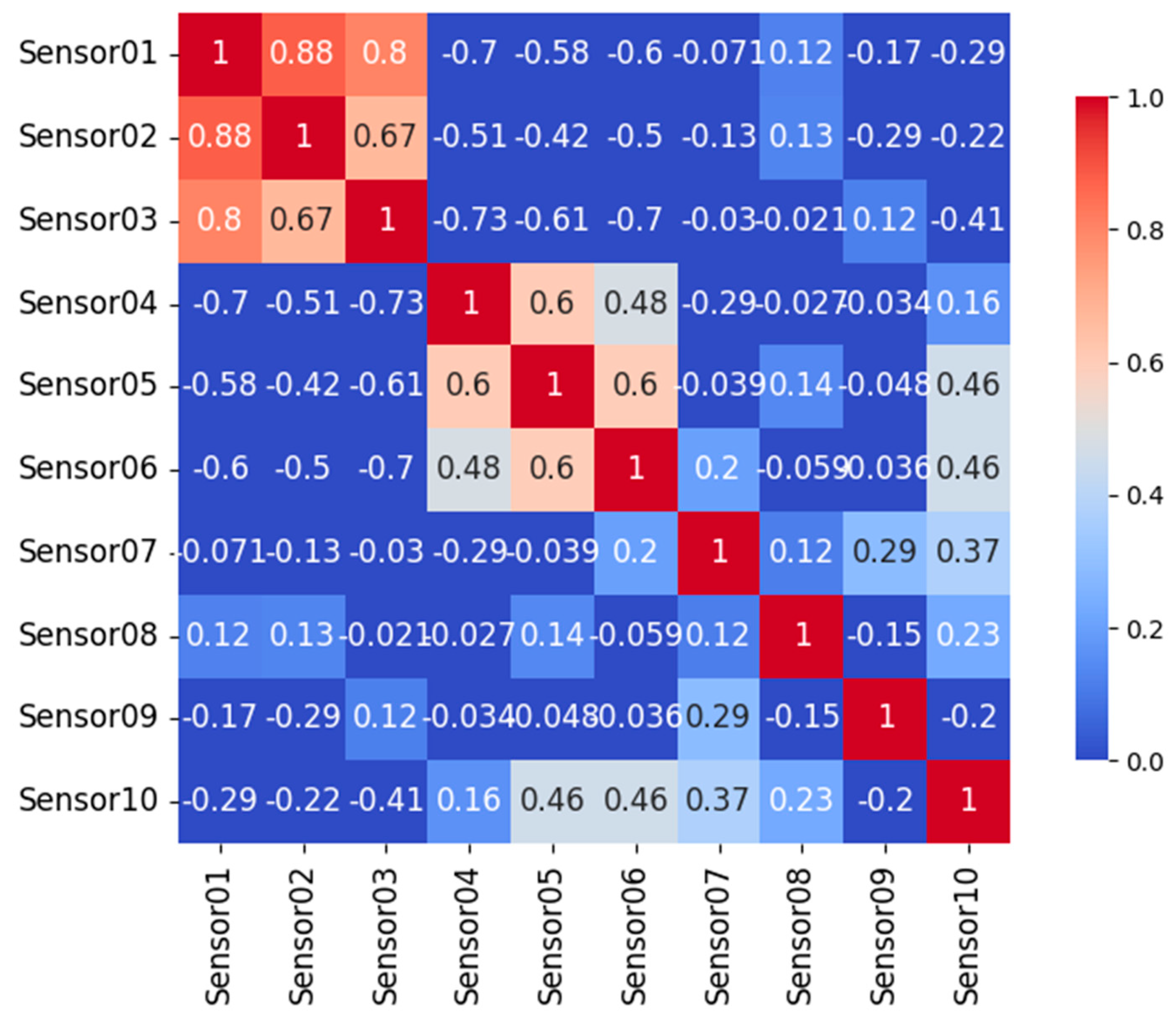 Figure 10 presents the correlation matrix of these temperature sensors. Strong positive correlations are observed among sensors with similar thermal exposure (e.g., Sensor01, Sensor02, and Sensor03), suggesting coherent thermal responses driven by shared environmental influences. In contrast, weaker or negative correlations are observed between sensors located in thermally decoupled regions (e.g., between Sensor01 and Sensor05–Sensor08), highlighting the spatial heterogeneity of the temperature field within the structure. The combination of the time-series and correlation analyses underscores the importance of considering both spatial sensor placement and local thermal conditions when interpreting temperature effects in structural health monitoring and deformation modeling.