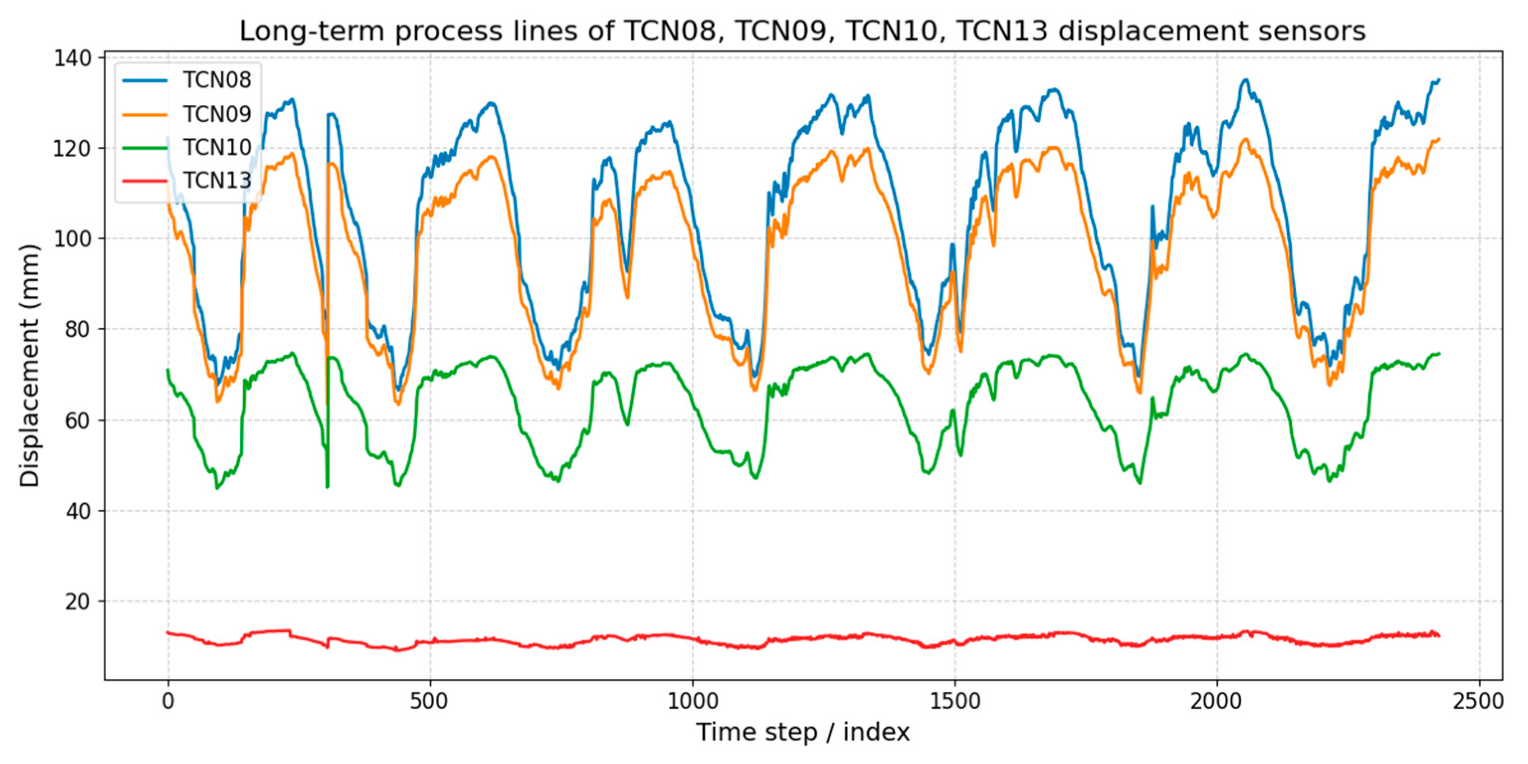 The visualization results of the dam displacement monitoring data can be seen in Figure 11. The long-term displacement records of these dam displacement sensors exhibit distinct temporal patterns with clear seasonal cycles and varying amplitudes. TCN08 and TCN09 show the largest displacements, ranging approximately between 90 and 140 mm, and are highly correlated in both magnitude and trend, suggesting that they are located in structurally similar positions. TCN10 displays lower amplitudes (50–80 mm) but still follows the same periodic fluctuation, indicating a consistent thermal or environmental influence across the monitoring system. In contrast, TCN13 remains nearly flat around 10–15 mm with minimal variation, reflecting either a structurally more stable position or reduced sensitivity to the external loading conditions. Overall, the results demonstrate spatial variability in structural response, where the relative magnitude and periodicity of displacement provide insights into both local boundary conditions and global deformation mechanisms.
