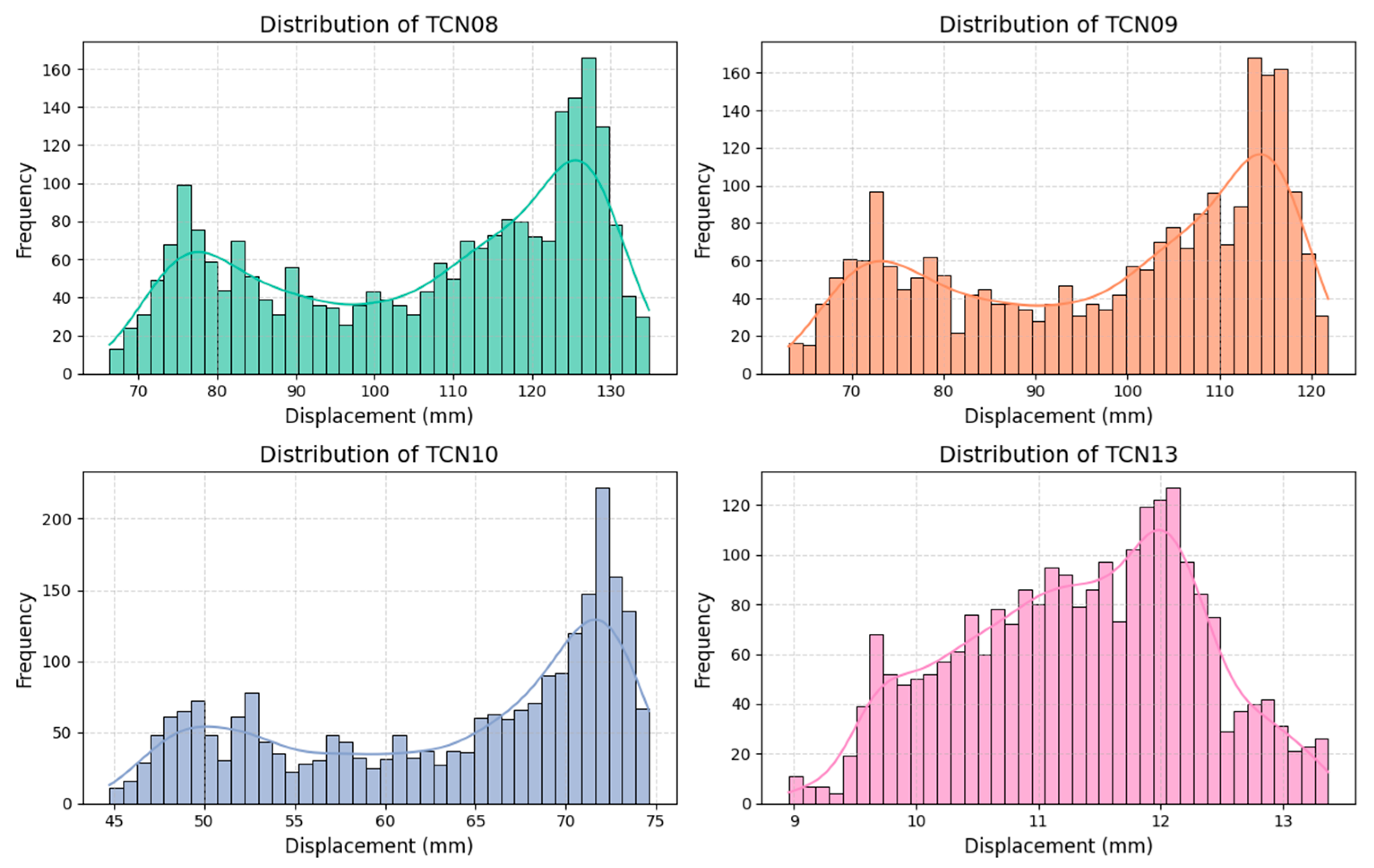 The displacement distributions of the four sensors can be seen in Figure 12, demonstrating significant variability in both range and central tendency. TCN08 and TCN09 exhibit broad distributions with higher displacement values, typically centered between 110 and 130 mm, indicating larger structural movement at their locations. TCN10 shows a narrower distribution within the 50–75 mm range, reflecting comparatively moderate displacement behavior. In contrast, TCN13 remains tightly clustered around 10–13 mm, suggesting that it experiences minimal deformation and is located in a structurally more stable region. The distinct differences in distribution among the sensors highlight the spatial heterogeneity of displacement responses, which may be attributed to varying boundary conditions, loading effects, or structural constraints at the monitored points.