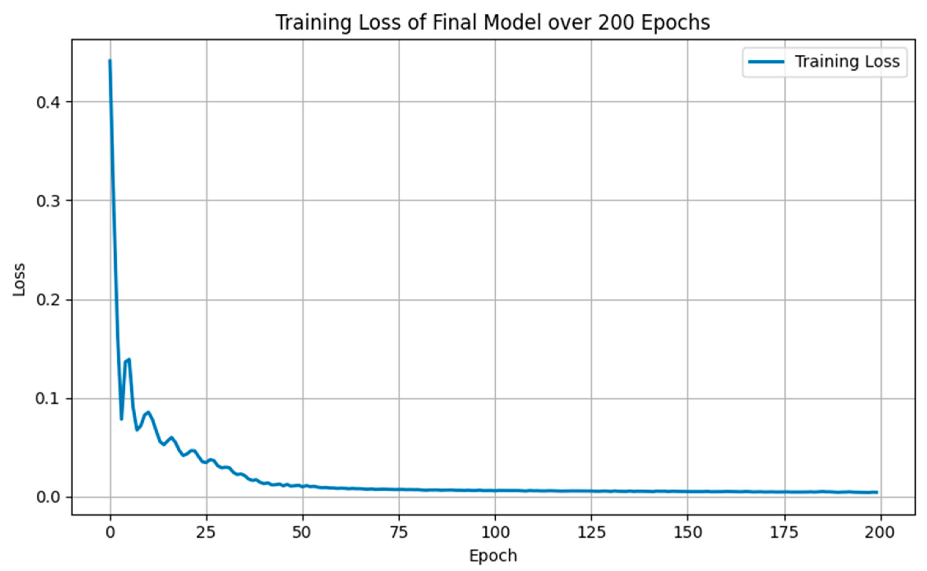 The training loss curve of the proposed CNN-GRU model can be seen in Figure 13, demonstrating a clear convergence trend over 200 epochs. Initially, the loss decreases sharply in the proposed method sharply during the first 20–30 epochs, indicating that the model rapidly captures the underlying patterns in the training data. As training progresses, the rate of loss reduction gradually diminishes, and from approximately epoch 50 onwards, the loss stabilizes at a low value close to zero. This behavior reflects effective learning dynamics, where the model transitions from coarse to fine adjustments of its parameters. The smooth and consistent decline without significant oscillations further suggests that the chosen network architecture and hyperparameter configuration provide stable training and good convergence properties, with no evident signs of overfitting.