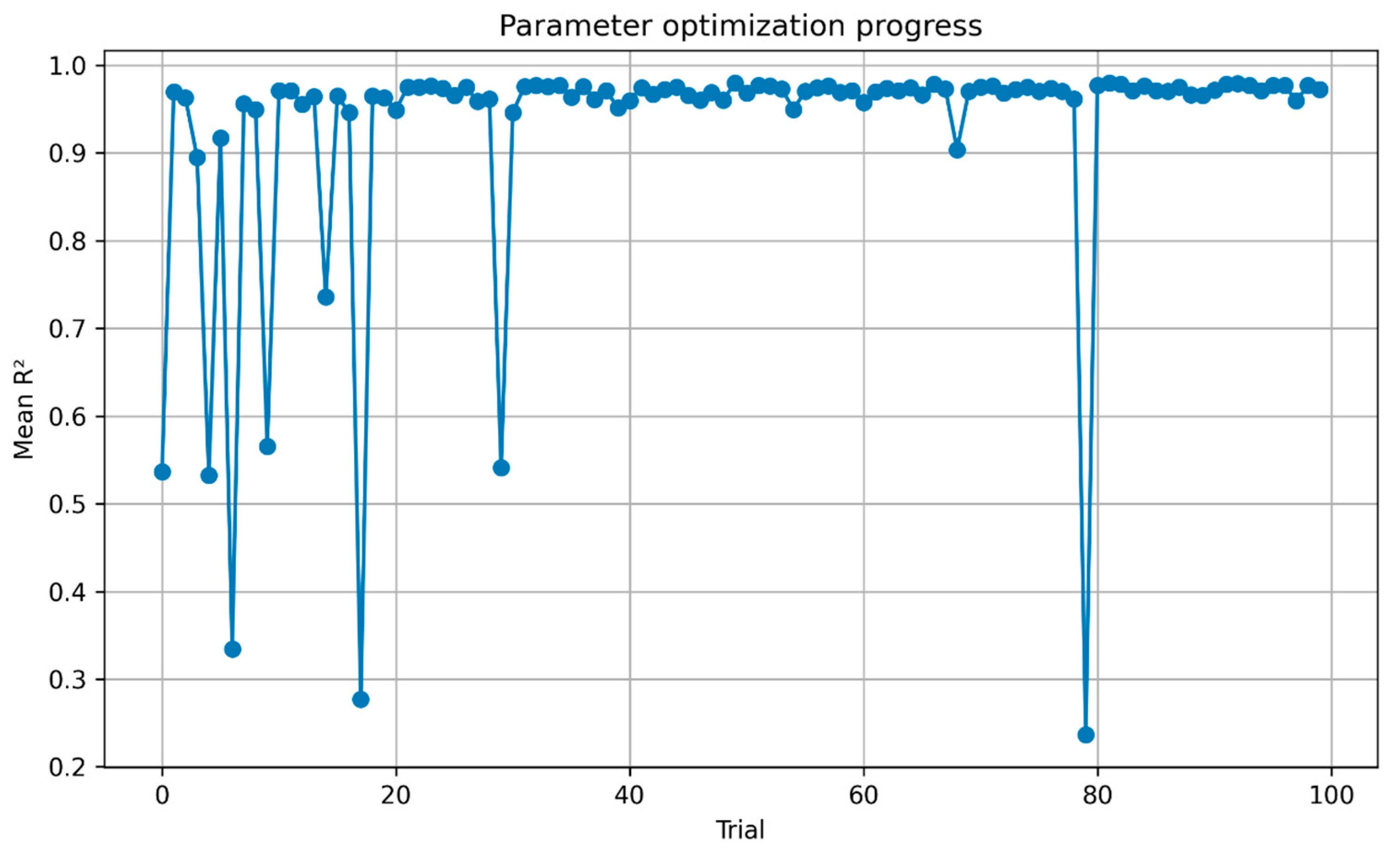 Figure 14 illustrates the optimization trajectory of the CNN–GRU model during hyperparameter tuning. The vertical axis represents the mean determination coefficient (R2) across validation folds, while the horizontal axis corresponds to the number of optimization trials. At the early stage of the search, substantial fluctuations are observed, with R2 values ranging from approximately 0.3 to 0.95, reflecting the sensitivity of model performance to different parameter combinations. As the optimization progresses, the search space becomes more effectively explored, and the performance rapidly stabilizes above R2 = 0.9 after roughly 25 trials. Beyond this point, most candidate solutions remain consistently close to the optimal range, with only a few outliers indicating less effective configurations.
