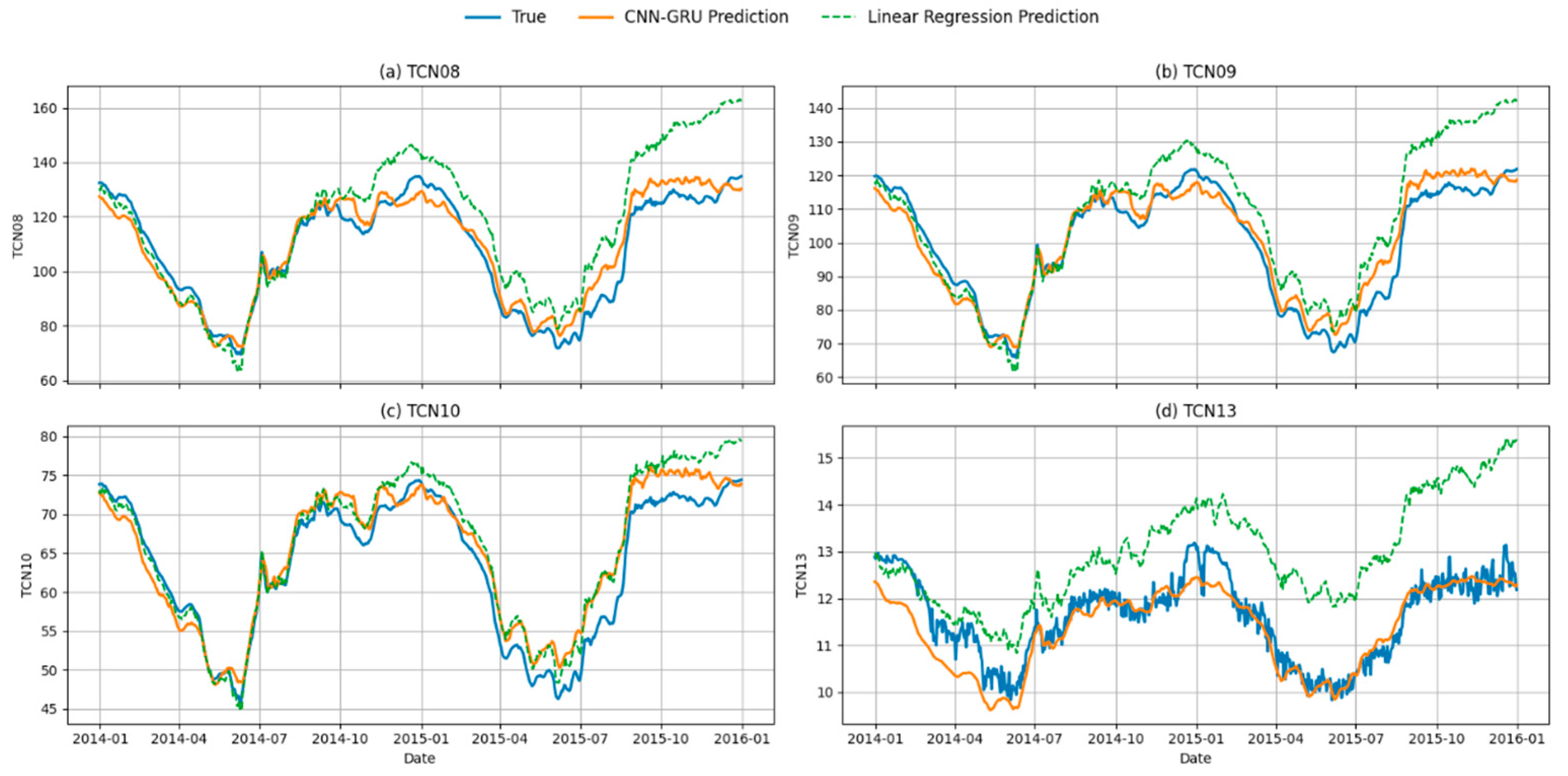 Table 3 compares the predictive performance of the proposed CNN–GRU model with the conventional multiple linear regression (MLR) method across four monitoring points (TCN08, TCN09, TCN10, and TCN13). The CNN–GRU consistently achieves higher R2 values (0.7364–0.9222) than MLR, which shows limited explanatory power and even negative R2 at TCN13. Moreover, the CNN–GRU substantially reduces RMSE, MAE, and MAPE across most points, with improvements being particularly significant at TCN08, TCN09, and TCN13. These results indicate that the deep learning approach not only enhances overall prediction accuracy but also provides more stable and reliable estimates in complex deformation scenarios.