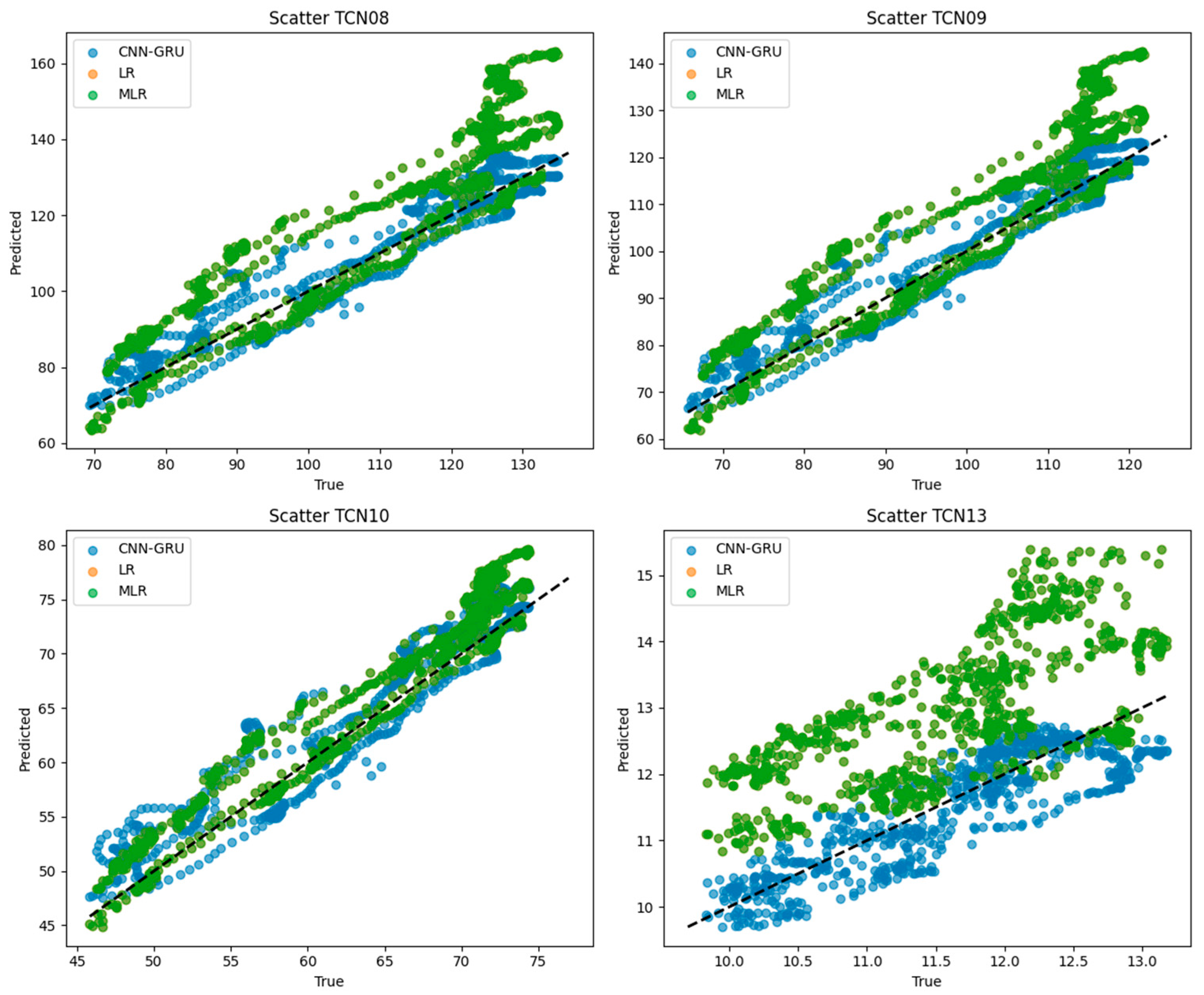 Figure 16 presents scatter plots of predicted versus observed dam deformation at four monitoring points (TCN08, TCN09, TCN10, and TCN13) using the proposed CNN–GRU model, linear regression (LR), and multiple linear regression (MLR). For CNN–GRU, the prediction points are more tightly clustered around the 1:1 reference line, indicating higher accuracy and lower bias across all locations. In contrast, MLR shows substantial deviations, especially at TCN08, TCN09, and TCN13, where systematic overestimation is evident. LR performs moderately but still exhibits larger dispersion compared with CNN–GRU. Overall, the figure highlights the superior predictive capability and robustness of the deep learning approach in capturing complex deformation behaviors compared to conventional regression methods.