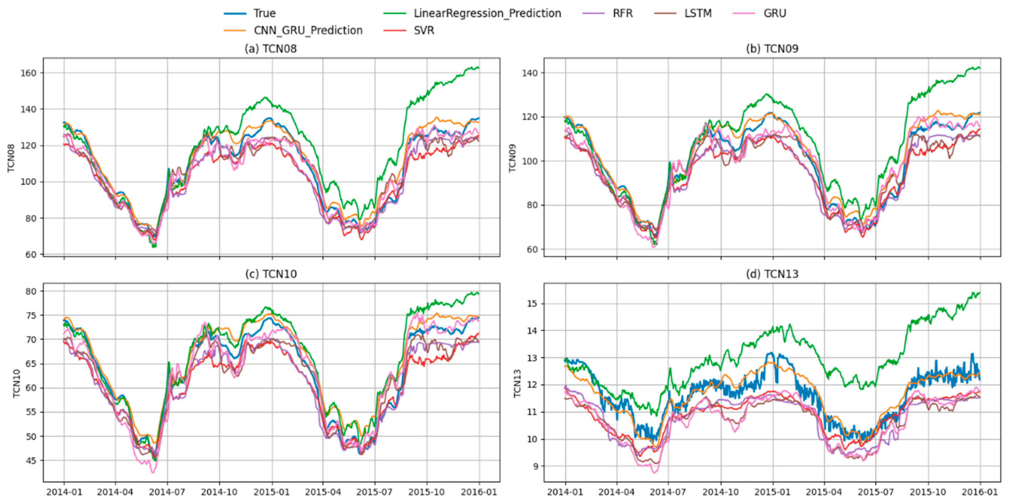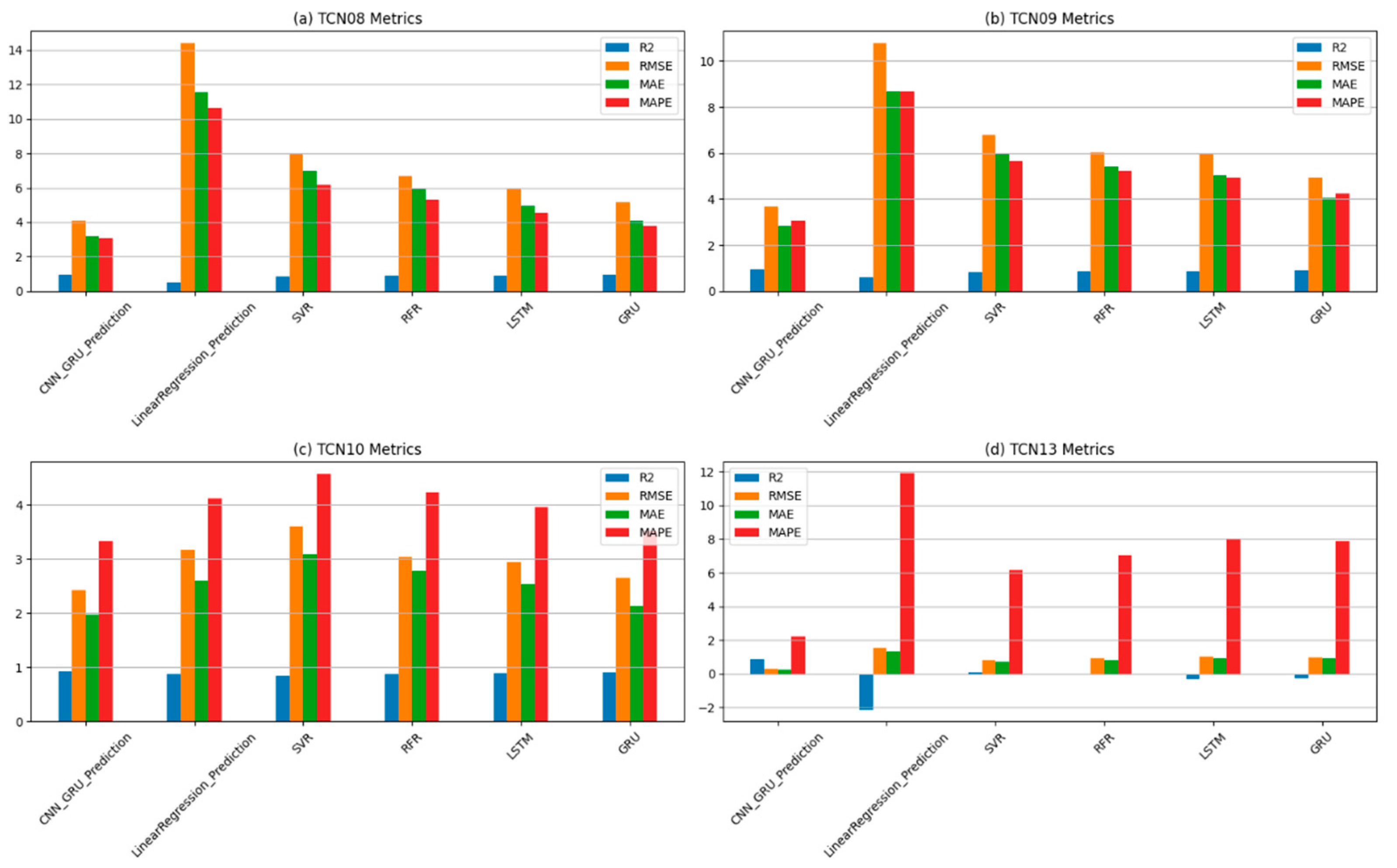 Figure 17 and Figure 18 present the time-series prediction results and corresponding evaluation metrics of different models at four typical monitoring points (TCN08, TCN09, TCN10, and TCN13). The proposed CNN–GRU hybrid model consistently demonstrates superior predictive performance compared to traditional machine learning models (Linear Regression, SVR, RFR) and standalone deep learning architectures (LSTM and GRU). In Figure 17, the CNN–GRU predictions closely follow the ground truth across all monitoring points, capturing both long-term deformation trends and short-term fluctuations. By contrast, Linear Regression deviates significantly, especially under nonlinear variations, and tends to over- or under-estimate deformation levels. SVR and RFR reduce part of this bias but still exhibit noticeable divergence during rapid deformation stages. LSTM and GRU show relatively good agreement with the measured data, but their predictions exhibit either smoother trajectories or small phase shifts that weaken the accuracy. The CNN–GRU model effectively balances these issues, showing both stability and responsiveness to deformation dynamics. In Figure 18, the evaluation metrics (R2, RMSE, MAE, and MAPE) further highlight the advantage of the CNN–GRU approach. At all monitoring points, CNN–GRU yields the highest R2 values and the lowest error measures, reflecting its ability to generalize across different deformation regimes. Linear Regression shows the weakest performance, with very low R2 and high errors, while SVR and RFR perform moderately. Deep learning baselines (LSTM and GRU) improve the prediction quality, yet CNN–GRU consistently outperforms them, indicating that combining CNN’s spatial feature extraction with GRU’s temporal modeling strengthens predictive capability.