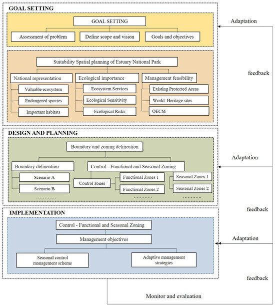 We developed a streamlined AM-oriented framework for spatial planning in Estuary National Parks (Figure 3), consisting of four interconnected phases: Goal Setting, Design and Planning, Implementation, Monitoring and Evaluation. Initially, Goal Setting involves a comprehensive problem assessment, defining scope and vision, and setting specific objectives. The ‘Suitability Spatial Planning of Estuary National Park’ approach was applied to establish conservation goals and objectives aimed at identifying a spatial plan that optimally conserves areas of national representativeness and ecological significance, while accounting for management feasibility. This process incorporated three key dimensions: national representation (including valuable ecosystems, endangered species, and key habitats), ecological importance (encompassing ecosystem services, sensitivity, and risk factors), and management feasibility (considering existing protected areas, World Heritage sites, and Other Effective Area-based Conservation Measures (OECMs)). During the Design and Planning phase, emphasis is placed on refining spatial organization through boundary delineation and zoning, supported by scenario-based spatial definitions and regulatory measures implemented via functional and seasonal zoning schemes.