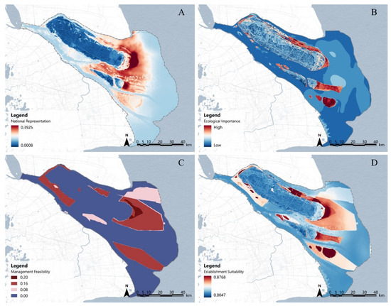 Evaluation results of the YRE National Park in terms of (A) National representation, (B) Ecological importance, (C) Management feasibility, and (D) Establishment suitability.