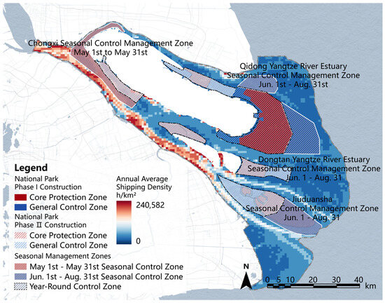 Further analysis and statistics were conducted on the space of shipping and cumulative shipping time of the proposed national park and the YRE in the past five years (2018–2023) (Figure 7). It was found that according to the scope of the first phase of planning, the overlapping area with shipping only accounted for 6.01% of the core protected area, but only 0.03% of the cumulative shipping time in the past five years, mainly for scientific research monitoring and patrol vessels; the overlapping shipping areas accounted for 4.48% of the general control area, but only 0.12% of the cumulative five-year shipping time, indicating that most areas were low-frequency shipping areas. Moreover, 73.96% of this area was the production and living area of the general control area of the national park, allowing normal navigation and other operations to be carried out without causing damage to ecological functions and meeting control requirements. In the planning scenario of expanding the construction scope in the second phase of the future, the core protection area and the general control area overlap with the shipping area by about 13%, accounting for only 1.43% and 8.13% of the cumulative five-year shipping time, respectively. Among them, 60.56% of the general control area is a seasonal control zone, which is only controlled during the stage when young fish enter the YRE for growing. It is not a thorough ban on shipping, but rather through control measures such as deceleration and prohibition of honking, to reduce the impact on the protected Chinese sturgeon. Therefore, through reasonable zoning and adaptive control strategies, the proposed national park will not have a significant impact on shipping at the YRE.