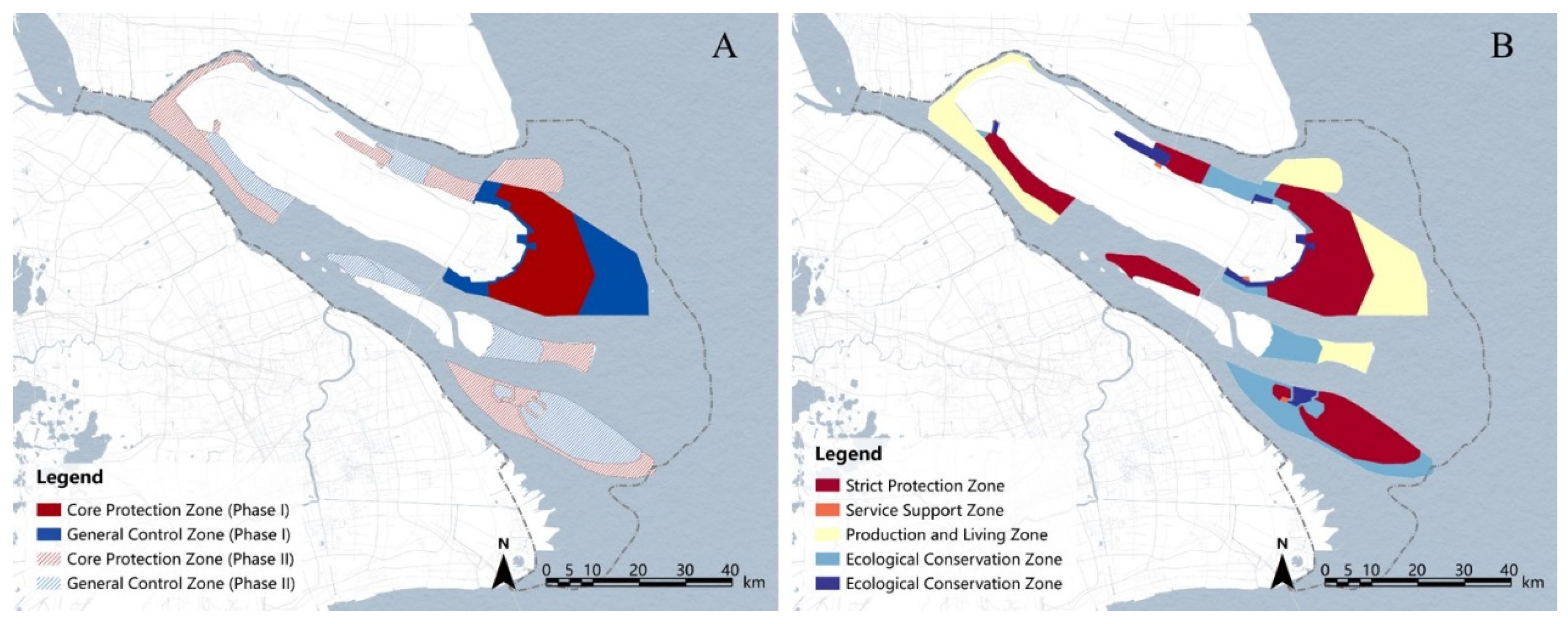 Core protected zone | Strictly protected area | Protect the concentrated distribution areas of Chinese sturgeon, white-headed crane and other national key protected wild animals and plants and their habitats, as well as the integrity and authenticity of the national representative coastal mudflat wetland natural ecosystem at the estuary of the middle and lower reaches of the Yangtze River. | 380.84 | 57.32% | 795.92 | 46.22% |