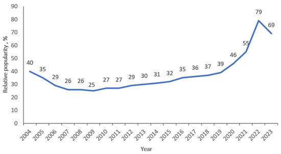 Web search interest in the “water sources” topic—relative popularity of queries in 2004–2023 (Source: Calculated using data from Google Trends [18]). Note: The data indicates trends in public interest, highlighting periods of increased attention to specific water management topics. Relative query popularity was calculated as the proportion of search queries for a given topic relative to the total search volume for all topics over the same period, normalized to a scale from 0 to 100 (low (0) to high (100)), indicating the relative level of interest in the topic.